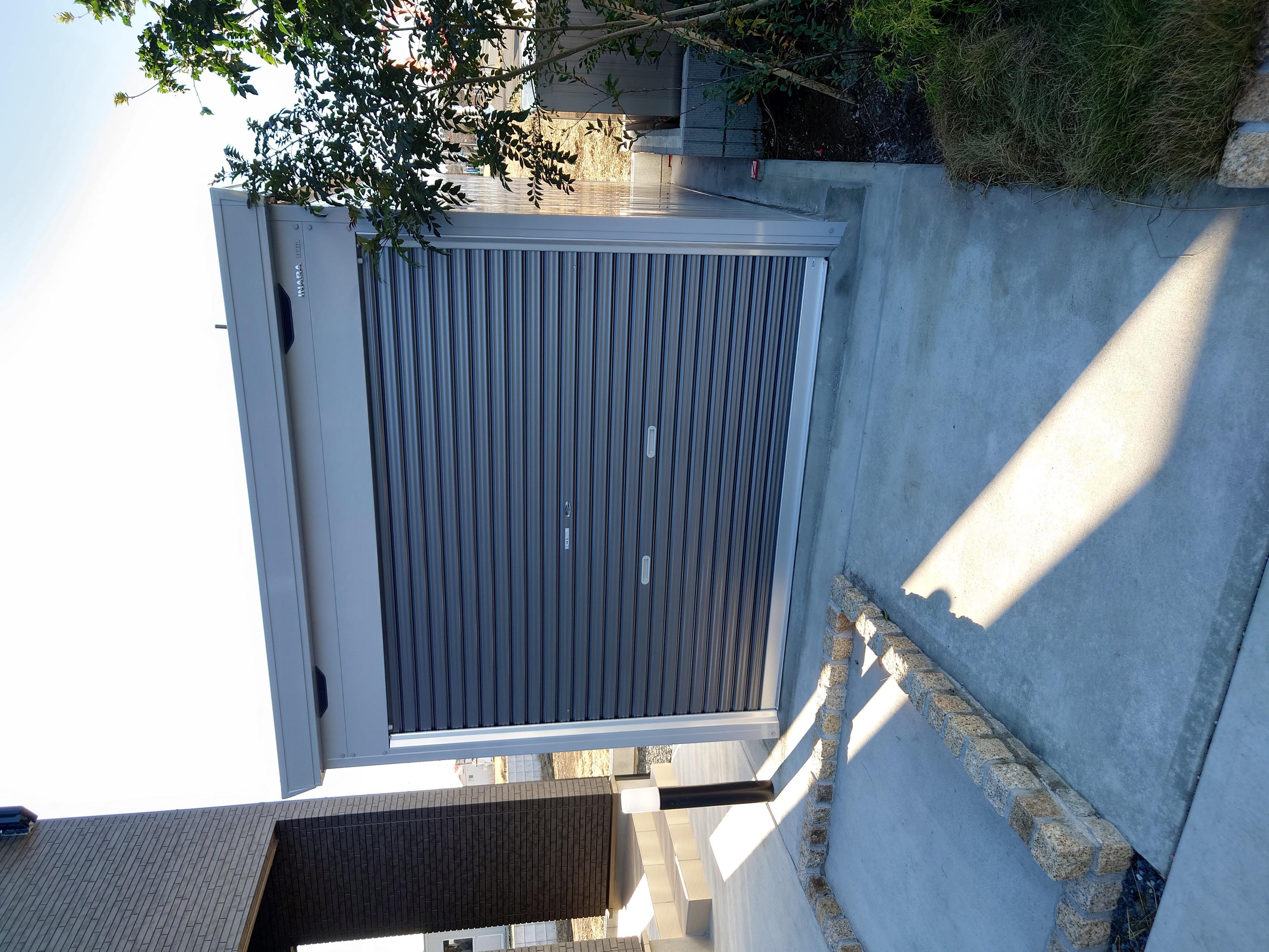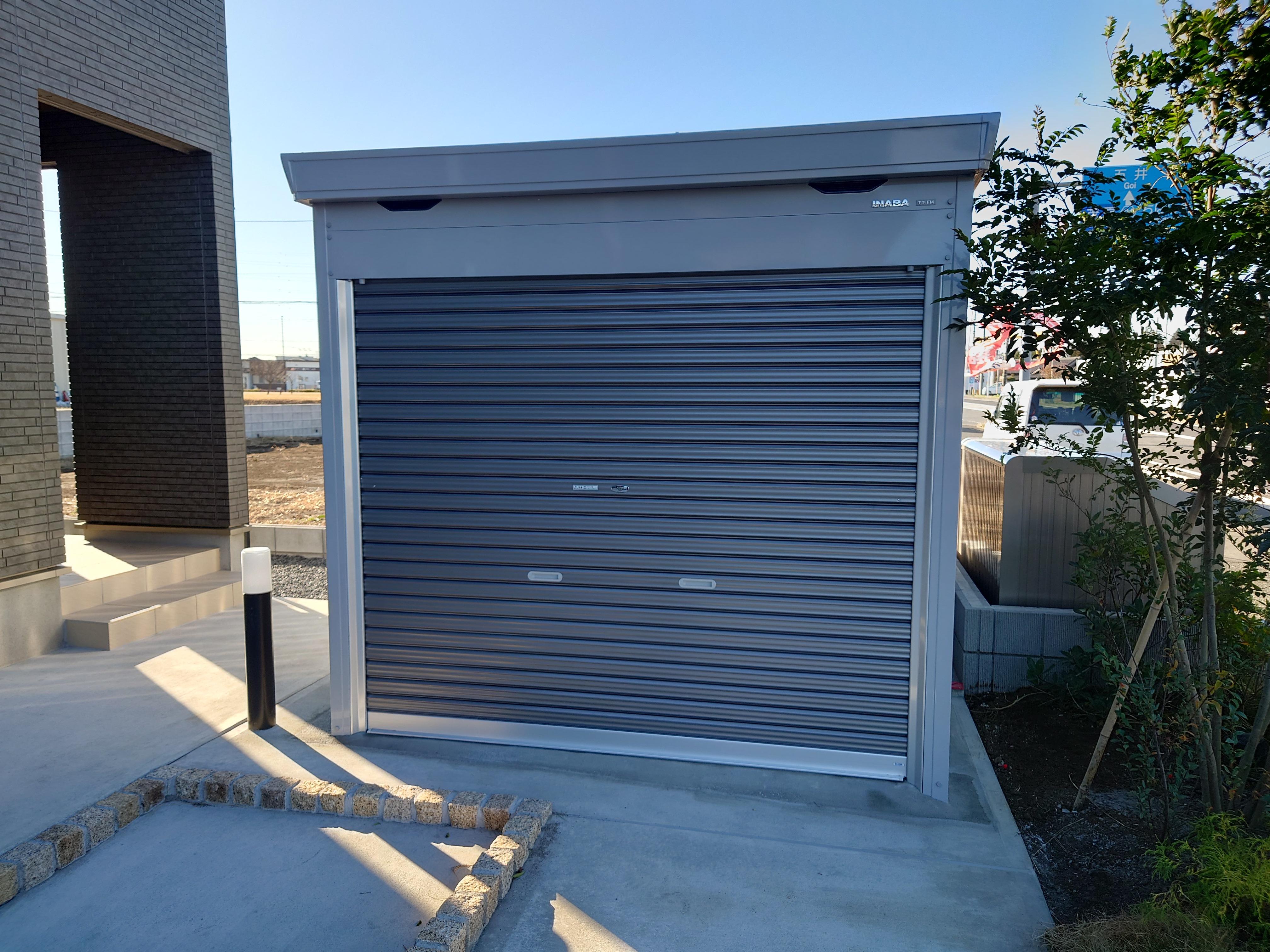 玄関前の空きスペースにバイクガレージを設置 新築住宅をご購入のお客様からのご依頼での工事となりました。 大型バイクの保管庫として、車の駐車スペース(2台分)とは別の場所に設置いたしました。 高低差(段差)が少しあったため、新築時に作ってあったブロックの土留めを解体し、進入路はスロープにしました。