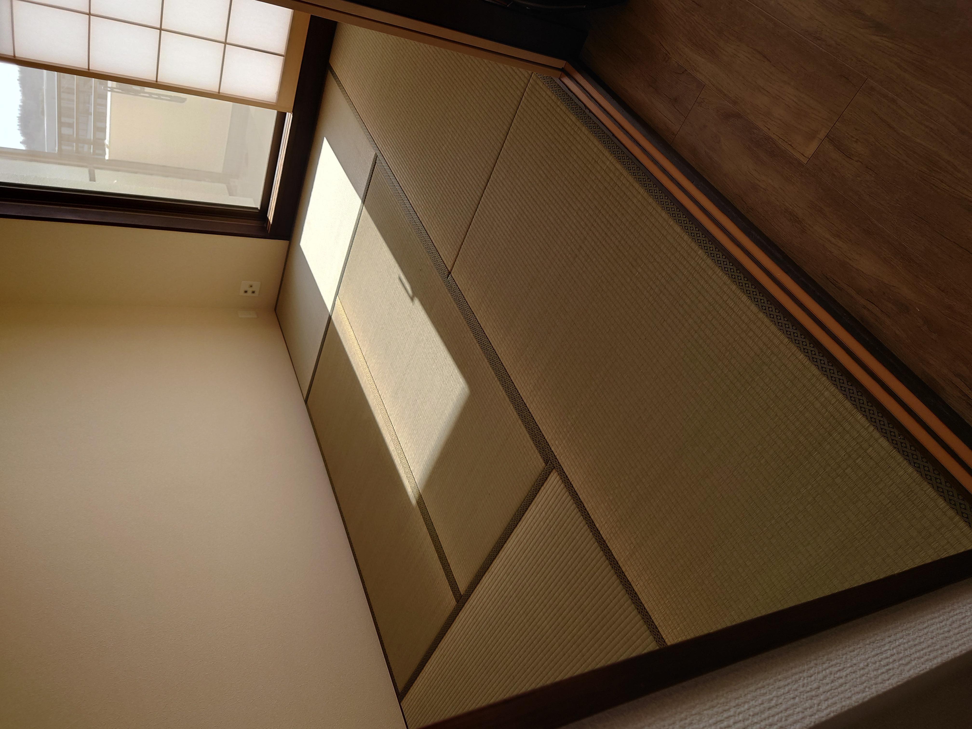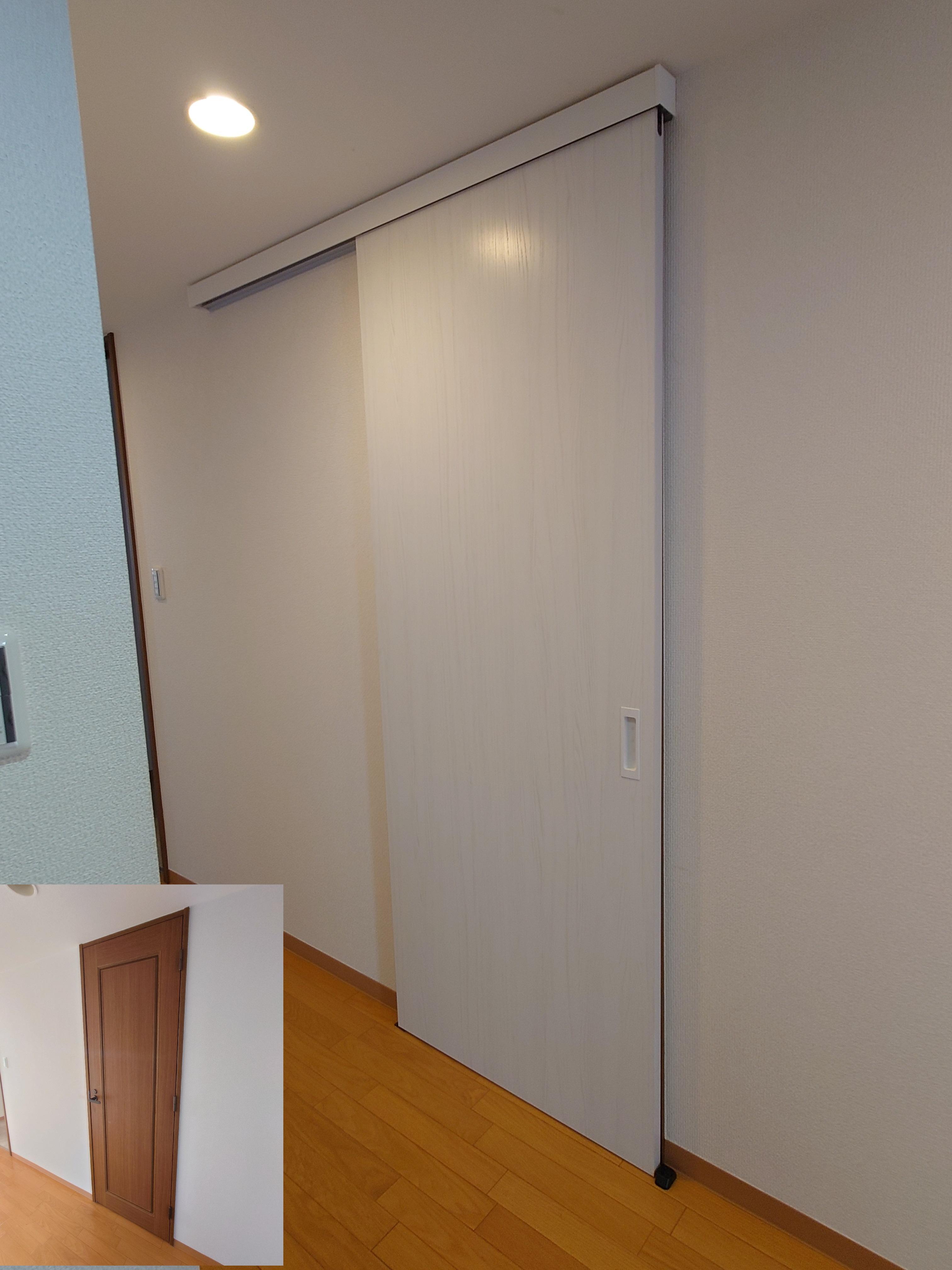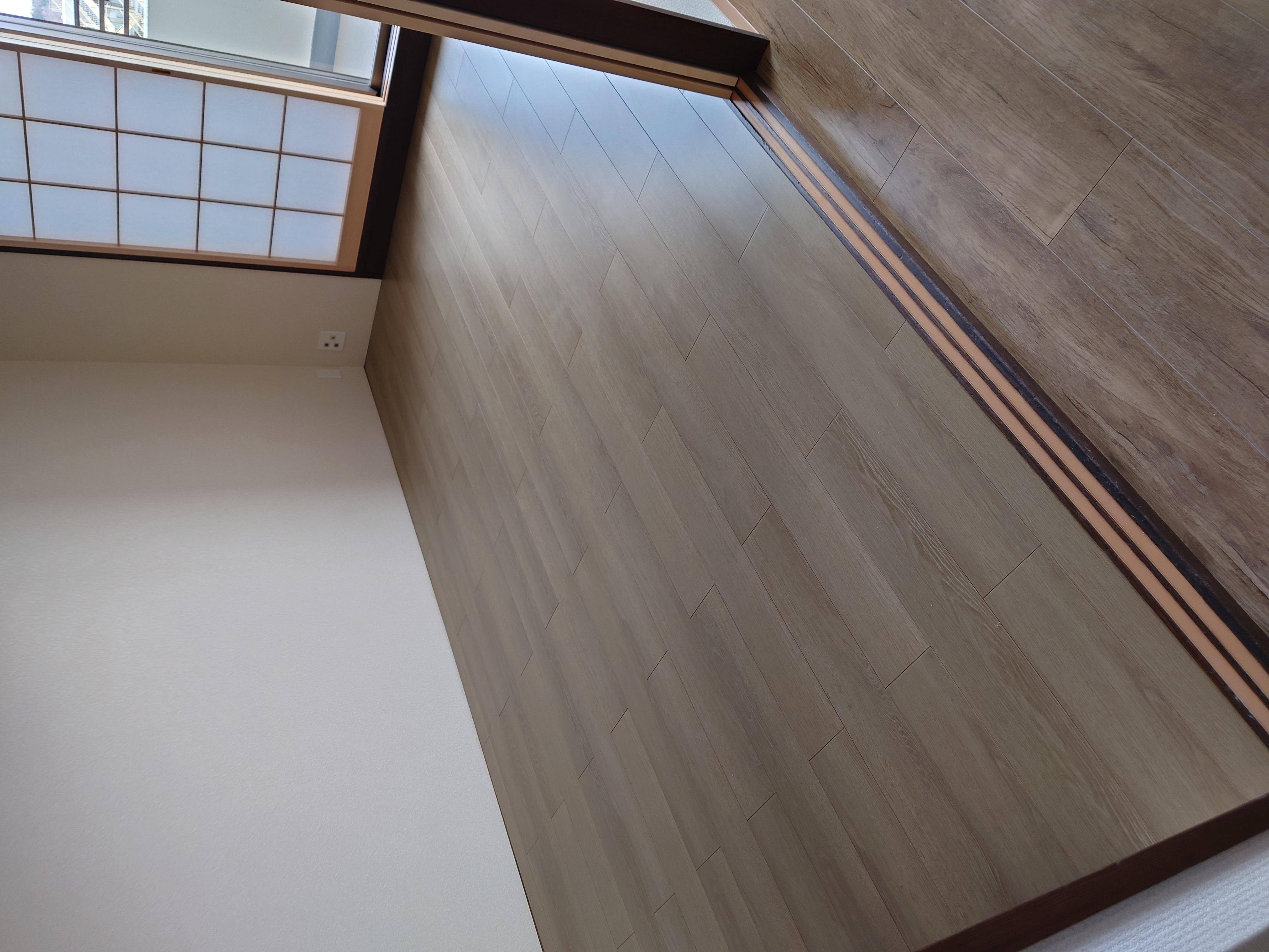 リフォーム済マンションを購入のお客様よりのご依頼で、和室の床(タタミ)をフローリングにし、洗面所入口ドアも撤去し引戸を採用致しました。