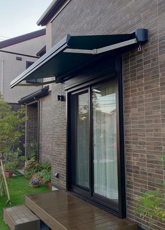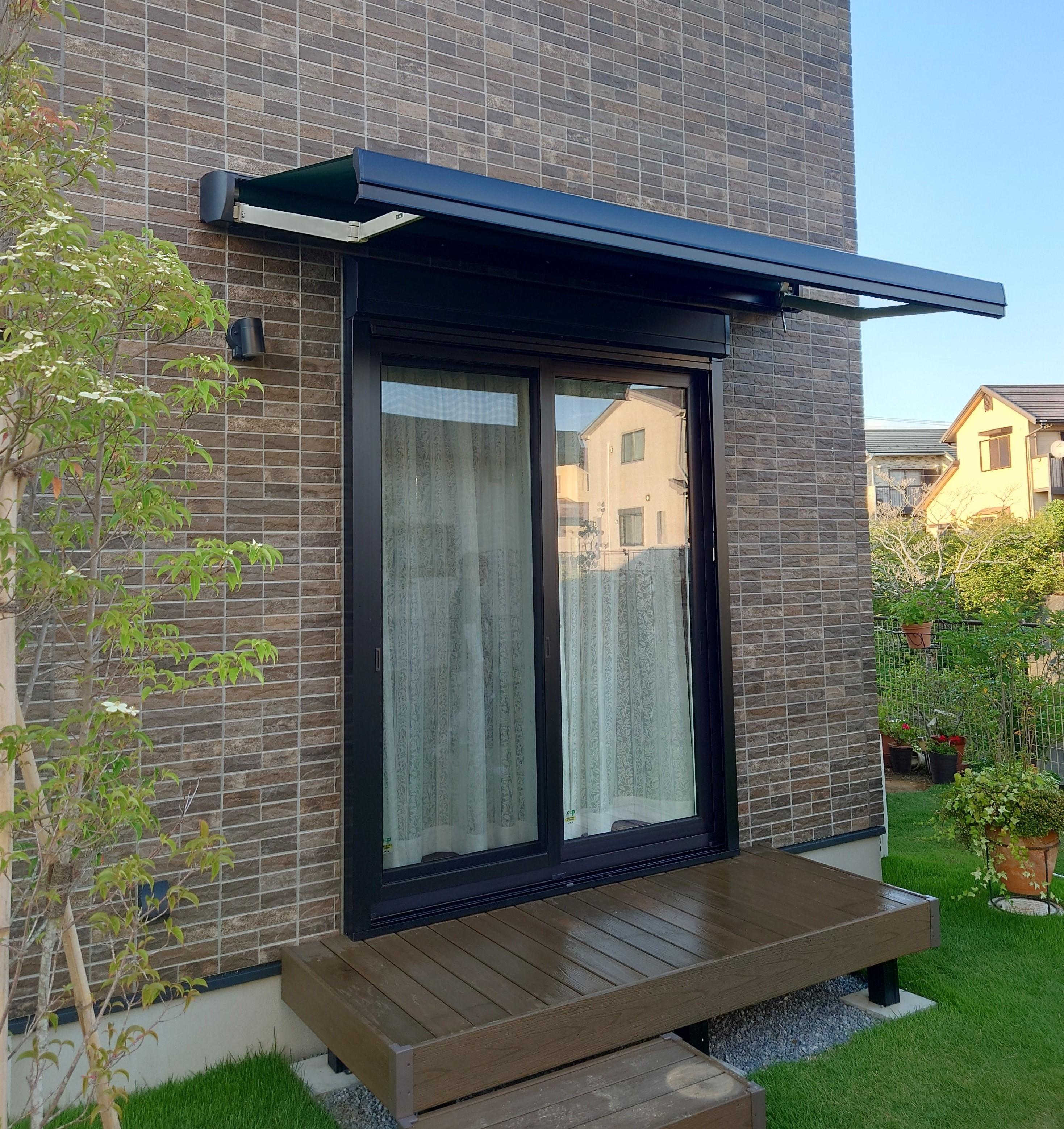 庭に面したテラス窓にオーニングの取付け施工を行わせて頂きました。 幅2.7m・出幅1.25mで既存のウッドデッキをスッポリと覆うことができます。 日当たりが良いお庭で、リビングに差し込む日差しもコントロールできます。 今後のガーデンライフがより一層、楽しくなることと思います。
