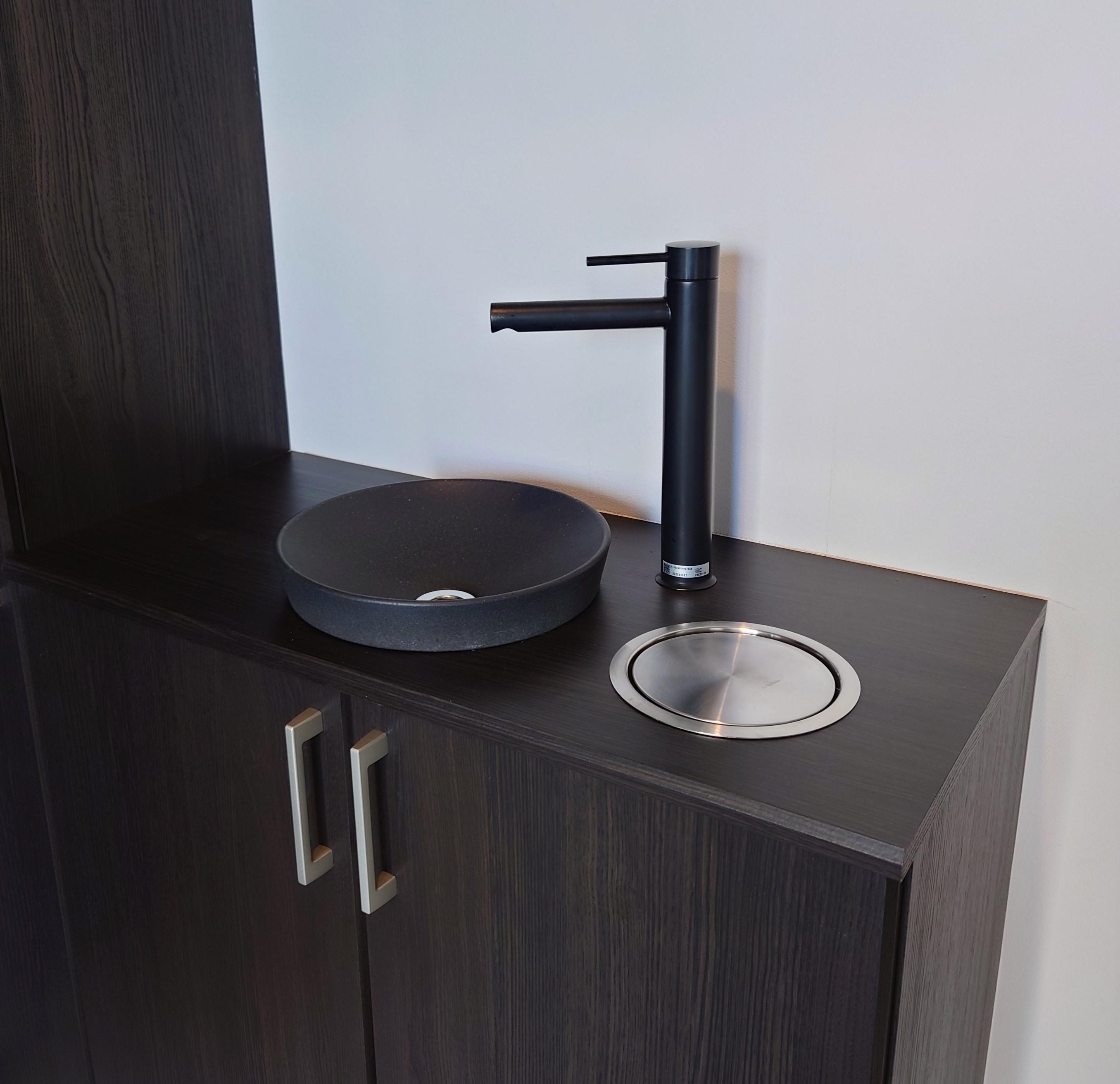 玄関に手洗い器設置の施工を行いました。 設置場所は、既存の玄関収納カウンターに信楽焼の埋め込みの丸形手洗い器を設置しました。 水栓もブラックの混合水栓をご選択いただき、また、ゴミの投入口まで設置しスッキリと使い勝手の良い手洗い場所となりました。 ご帰宅後に直ぐに手を洗うことが出来ますので清潔に室内へ入ることが出来る様になりました。