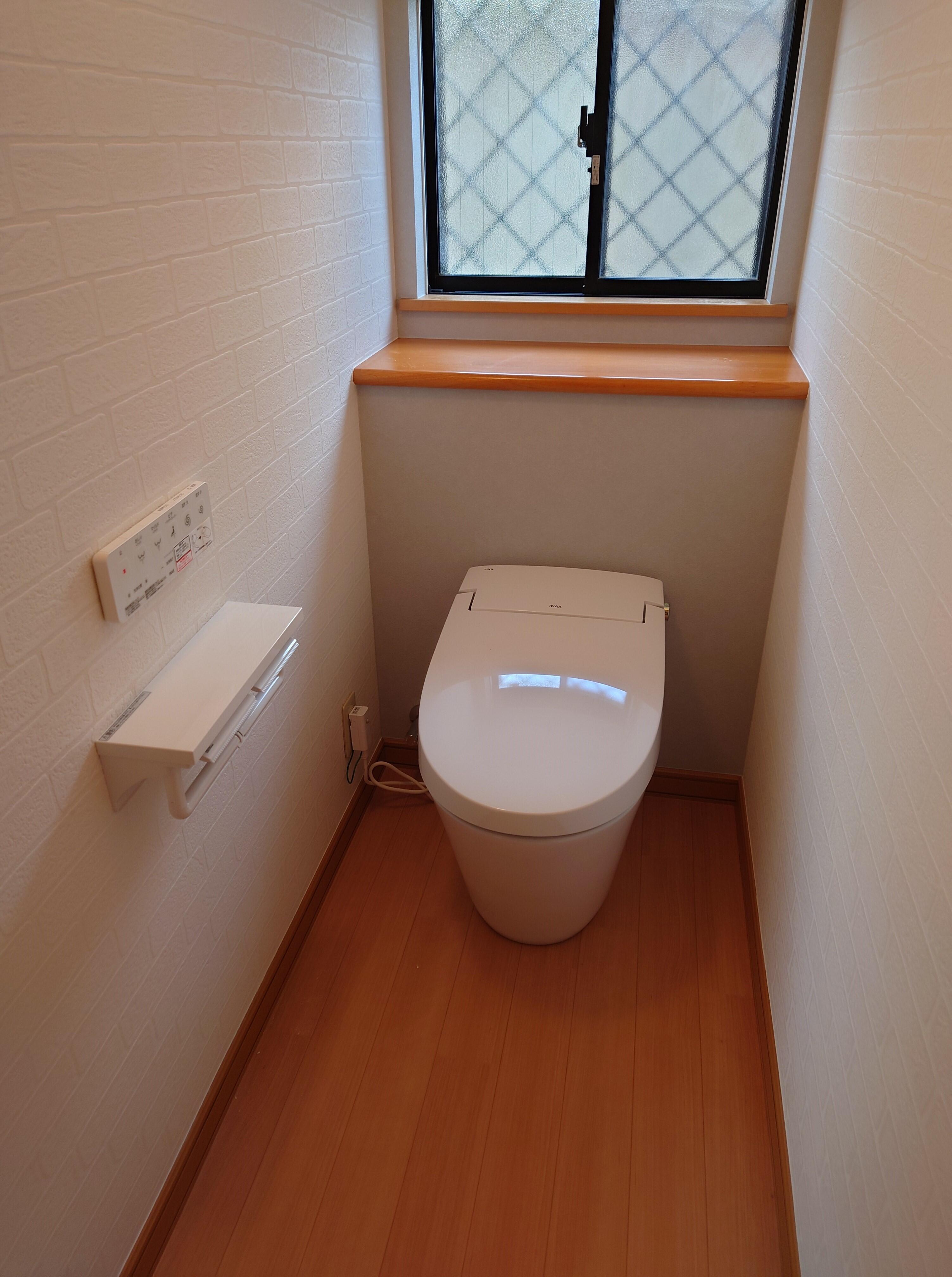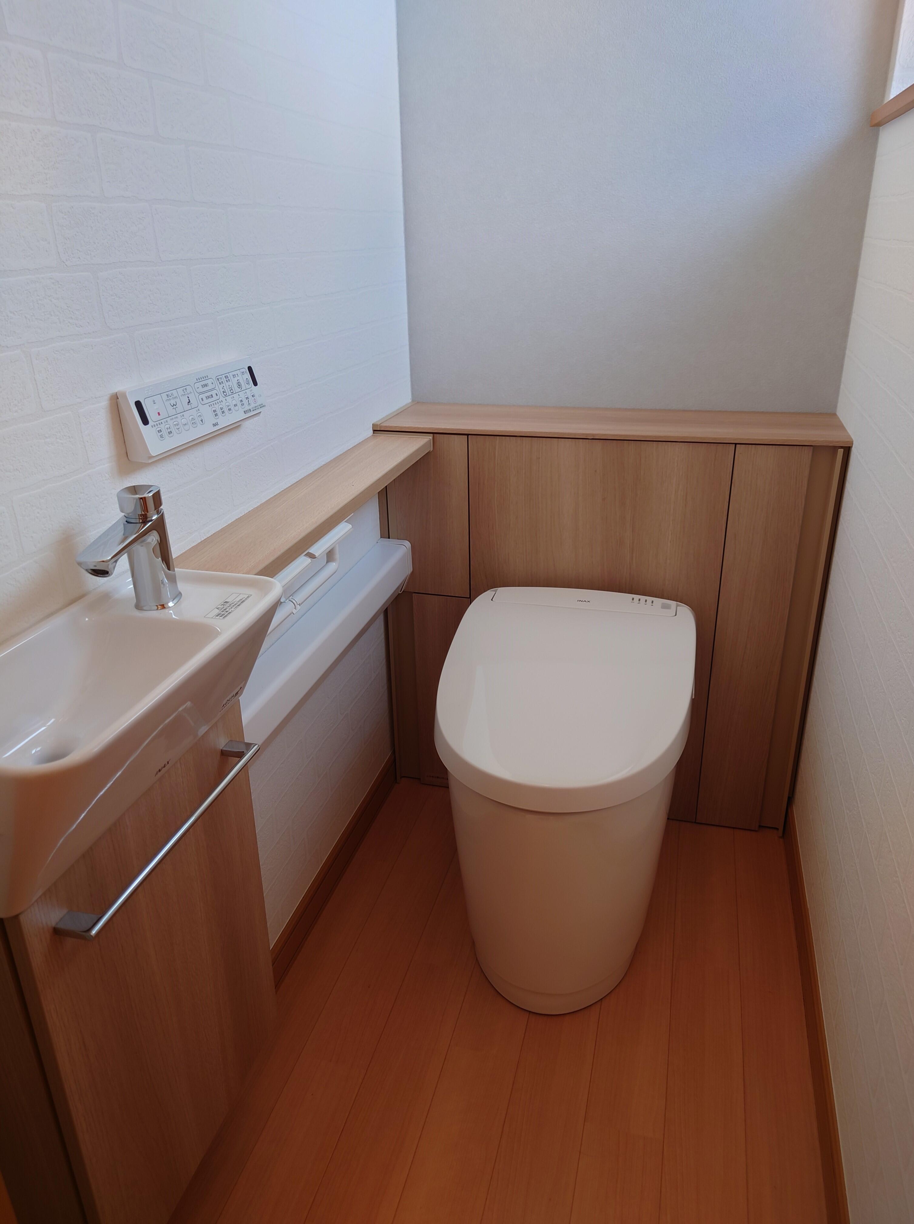 キャビネット付トイレ「Jフィット」の設置を行いました。 見た目スッキリ・お掃除しやすく・使いやすいしっかり収納そしてL型プランで手洗いが手前にあるのでお手入れもしやすくなっています。 毎日、何度も使う場所なのでお施主様のこだわりも同感できます。 そして、もう1ヵ所のトイレも階段下の限られた空間なので、コンパクトな「サティスS」を採用していただきました。