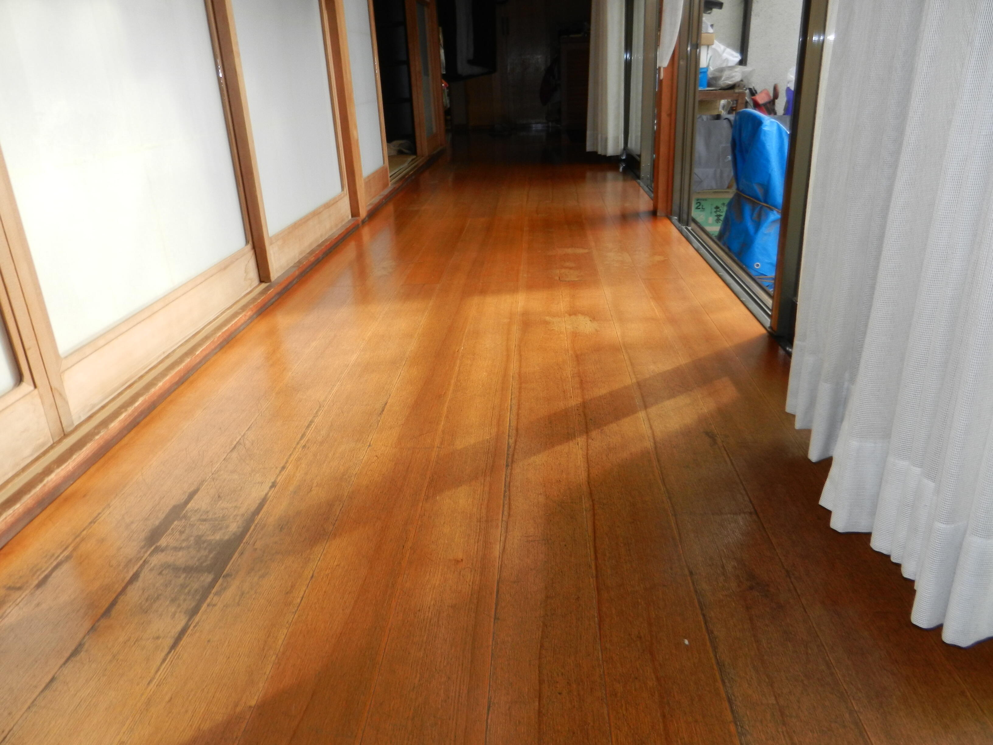経年劣化により退色・反り・シミが見られた広縁(縁側)の床を全面的に張り替えました。