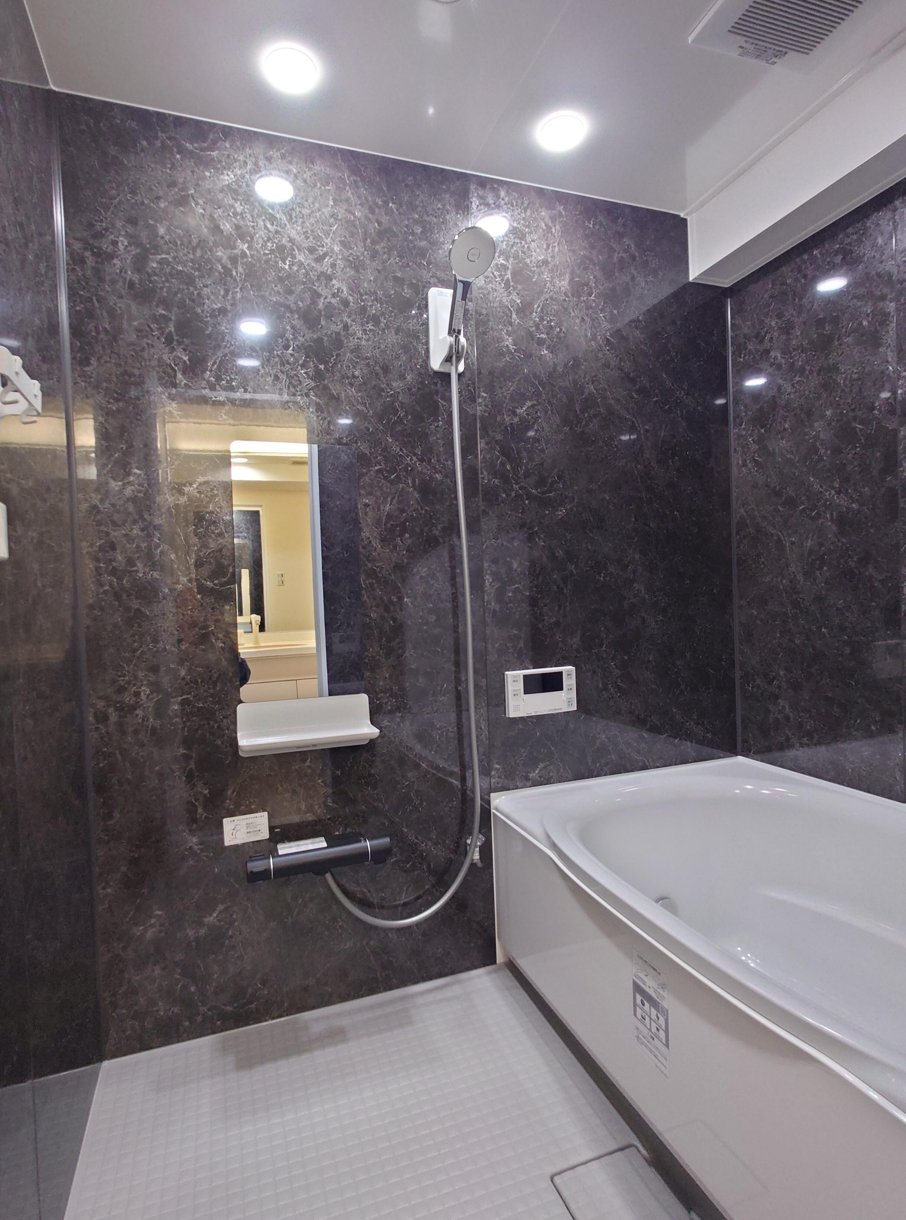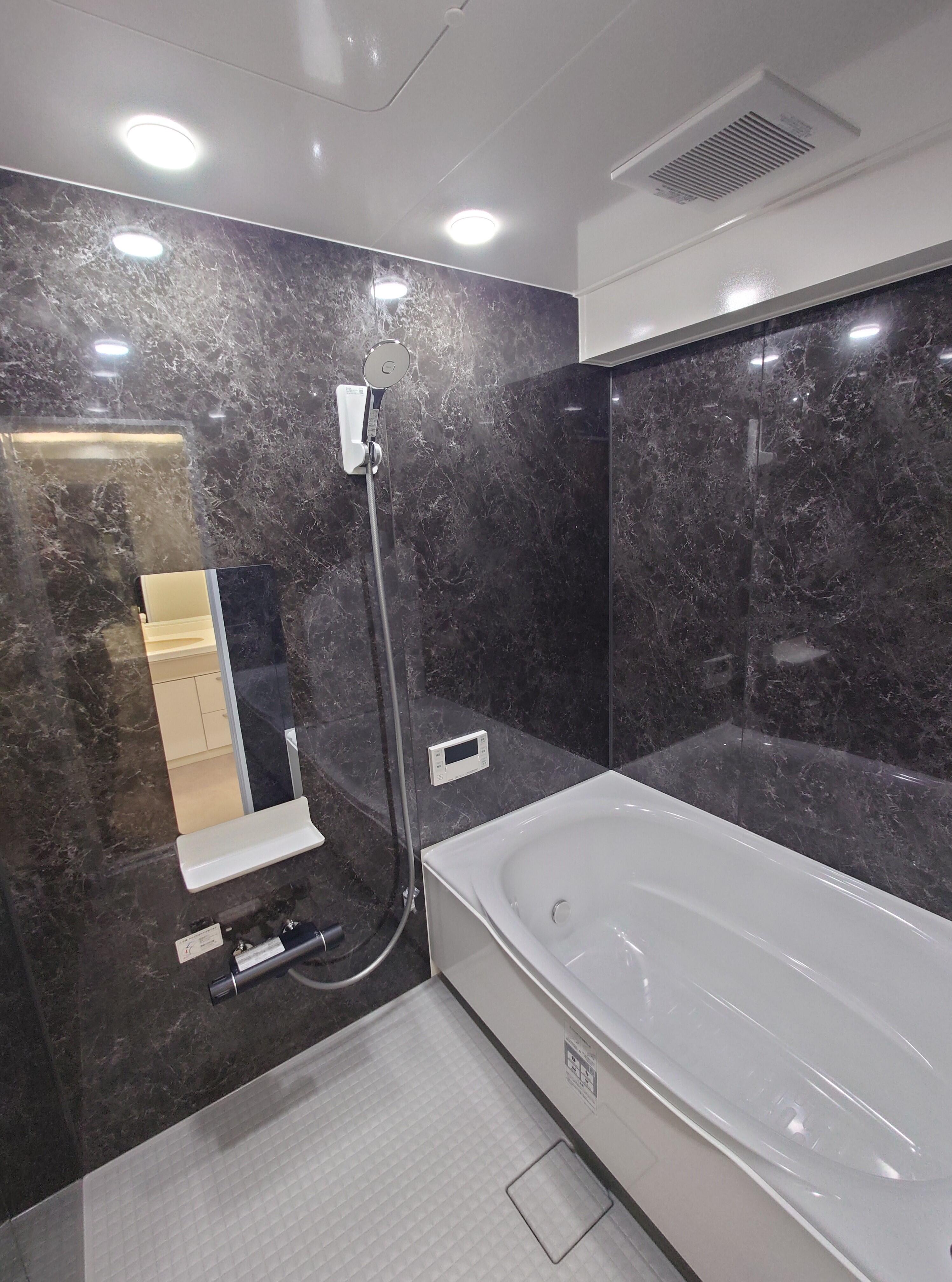 弊社、不動産事業部にてマンションご購入のお客様のリフォーム工事を施工致しました。 浴室は、マンション用システムバス「リノビオ」を採用し、黒い石目調のモダンなパネルを全面に施し、バスタイムが特別な時間となります。また、鏡や棚、タオル掛け等はマグネット式で脱着可能なのでお手入れもラクラクです。