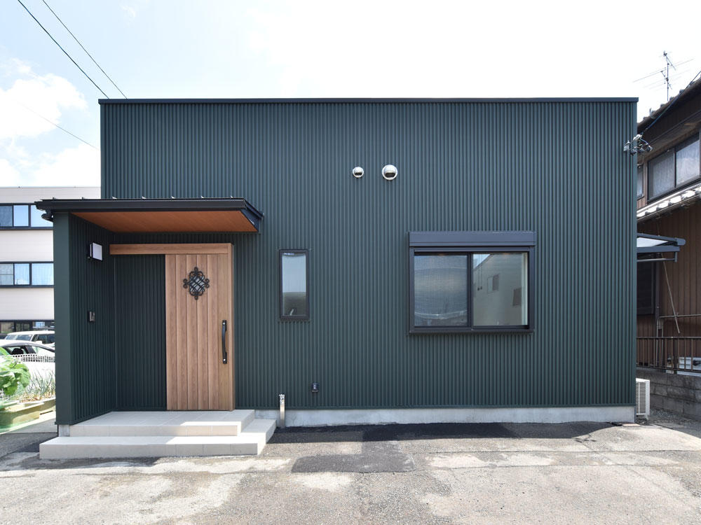 「外観のイメージを変えたい」との奥様のご要望でモスグリーンのガルバリウム鋼板を採用。