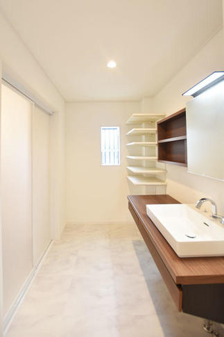 洗面脱衣所は、奥様こだわりの幅が1.5mある洗面台を設置しドレッサーとしても活用できるようになっています。