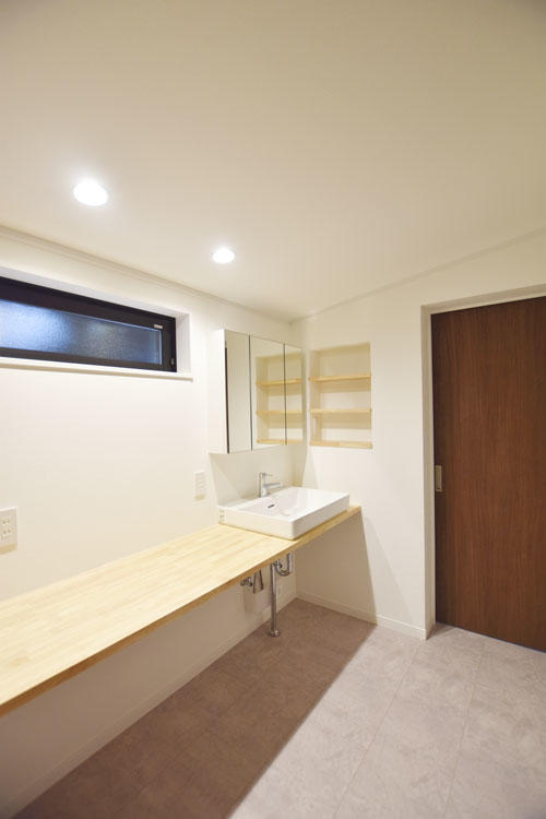 そこで、洗面とランドリースペースを併設しすぐ横に6帖程のファミリークローゼットを配置することで洗濯関係に関する家事が一ヶ所に集約できる工夫をしました。