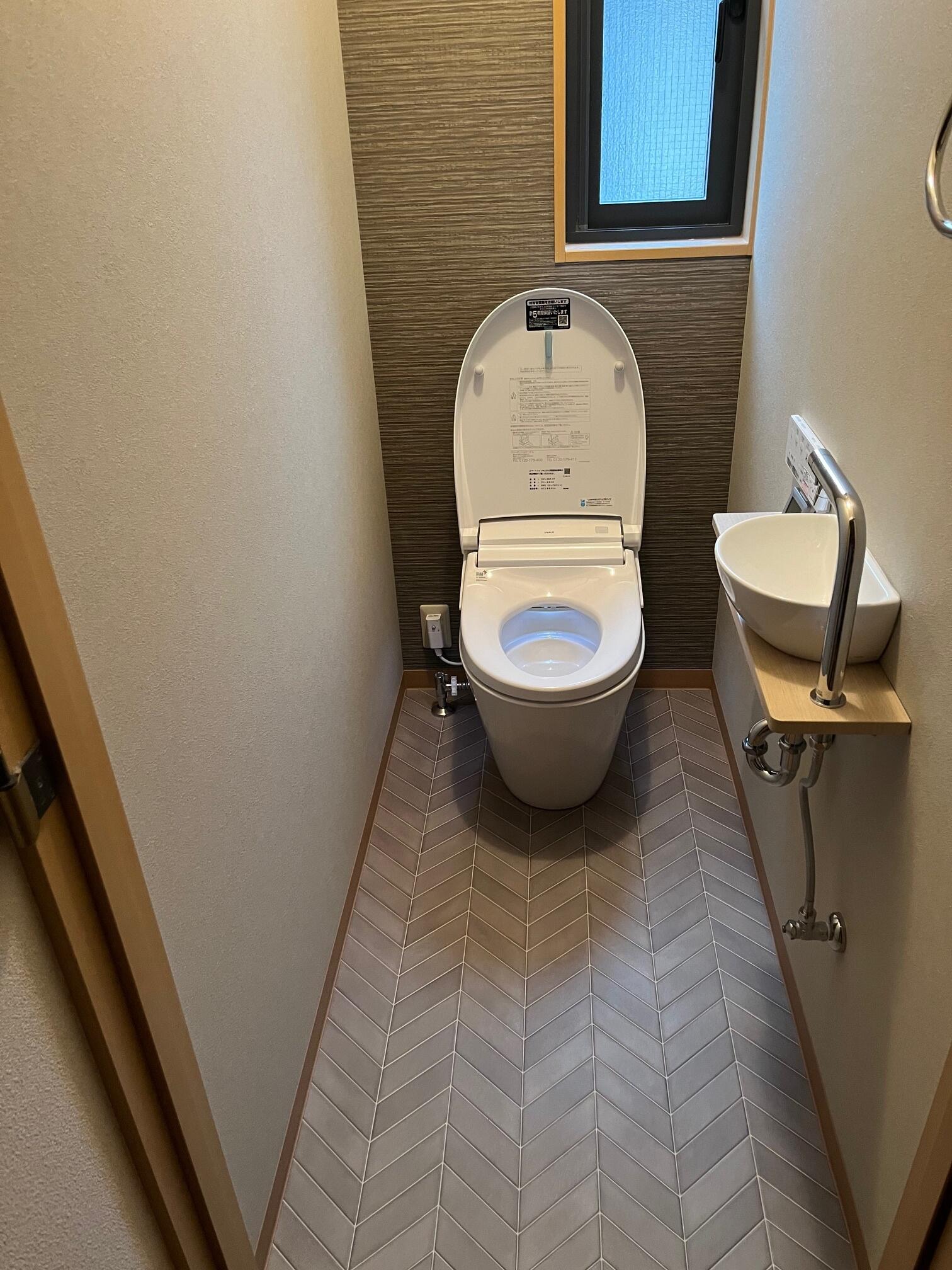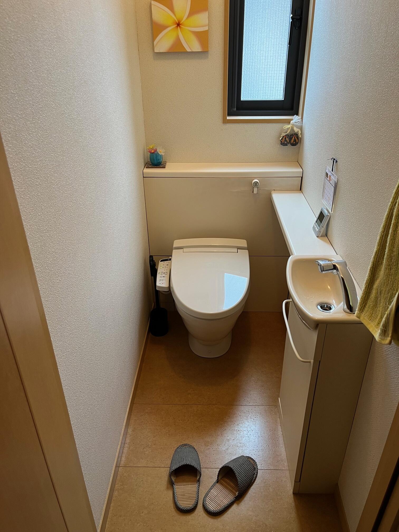トイレの施工例です。 LIXILのトイレ「サティスS」色はオフホワイトです。 シンプルデザインに先進機能を搭載しています。 調和もしやすく、コンパクトなのでゆとりの空間を生みます。