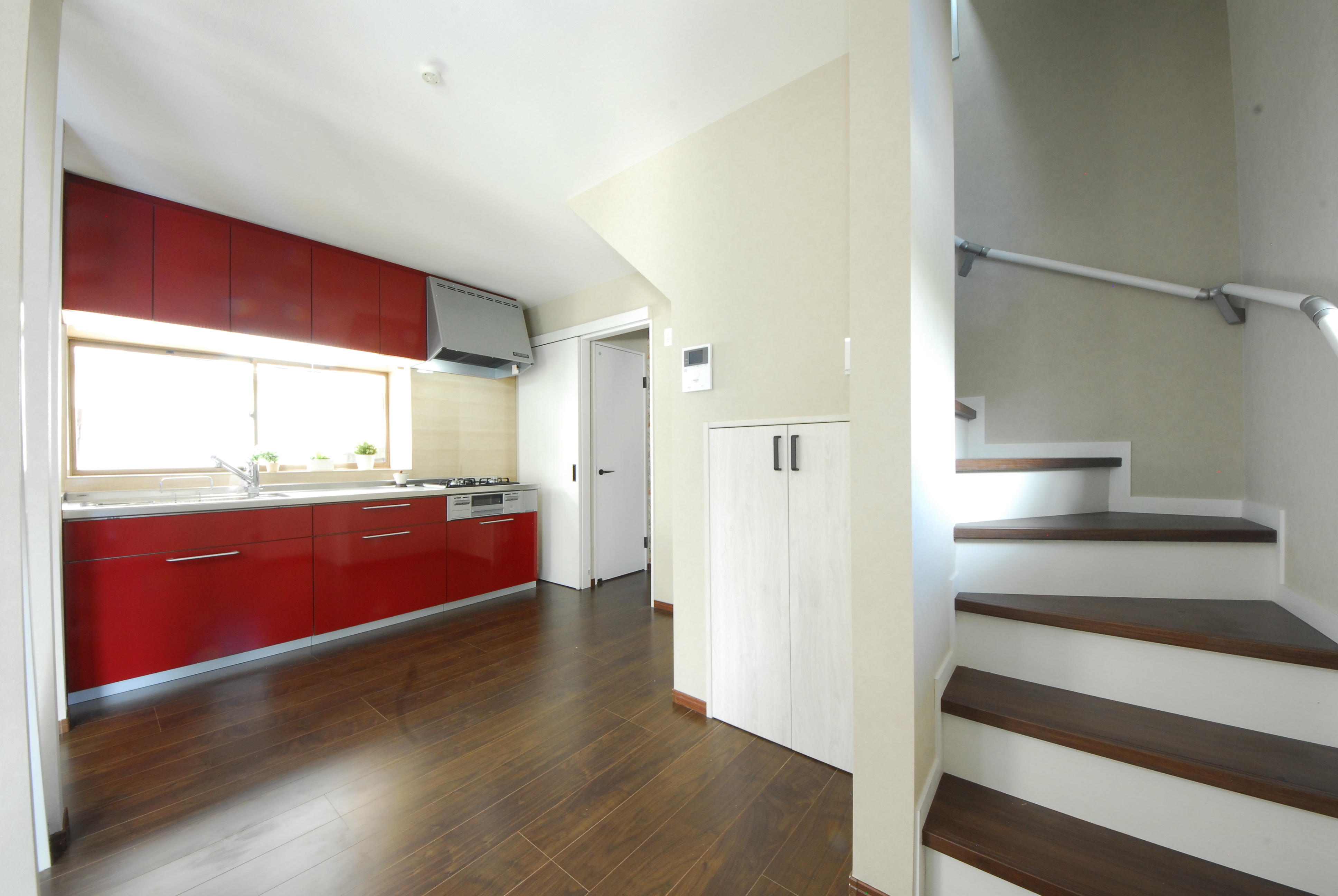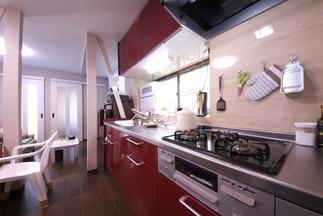 赤いキッチンがお部屋のアクセントに。システムキッチン:LIXIL シエラ 扉ディープレッド色I型 本体間口240cm