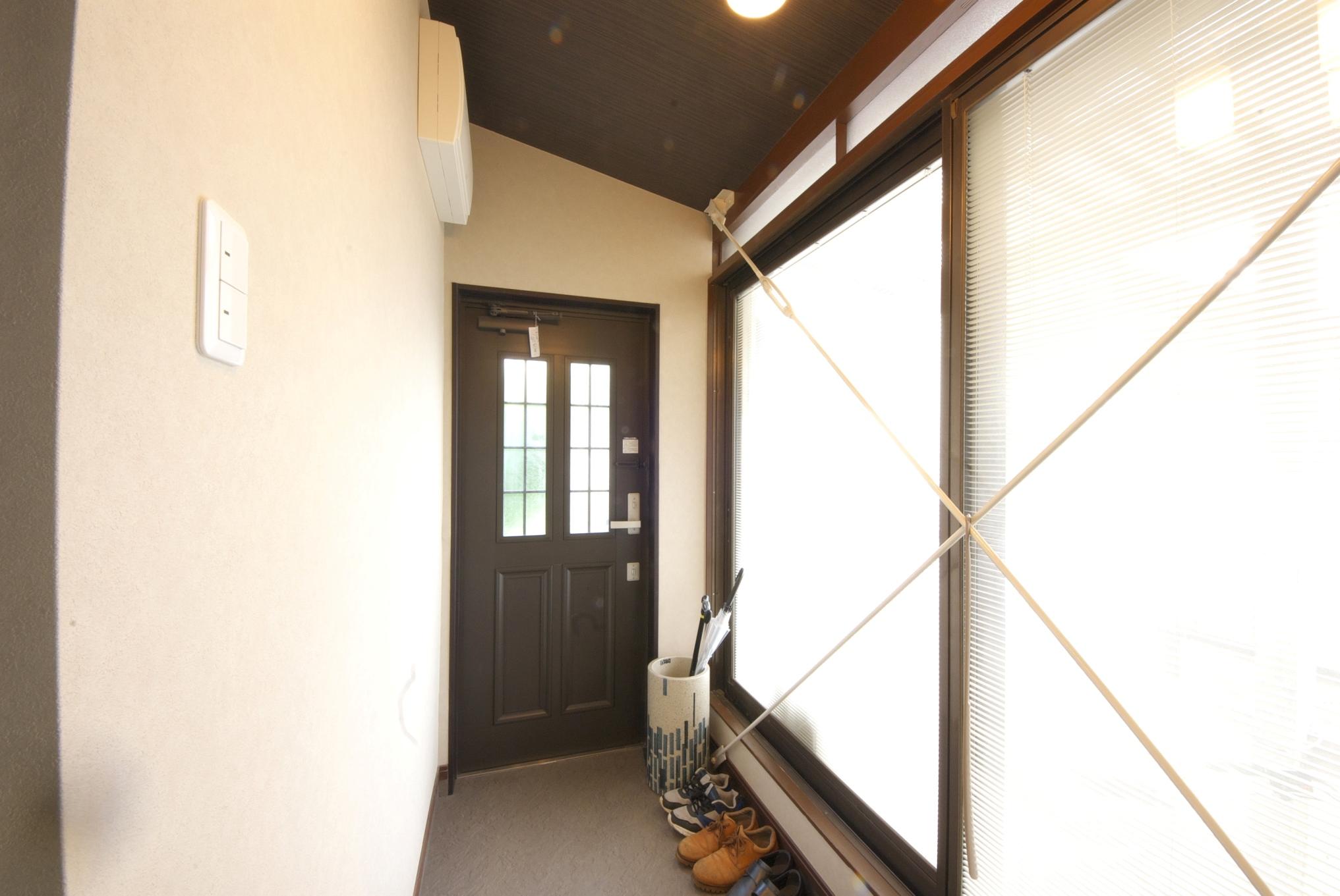 玄関は南側に移動しました。既存の大きな窓を残したので、ブレースを入れて壁補強をしています。玄関ドア:LIXIL:クリエラR