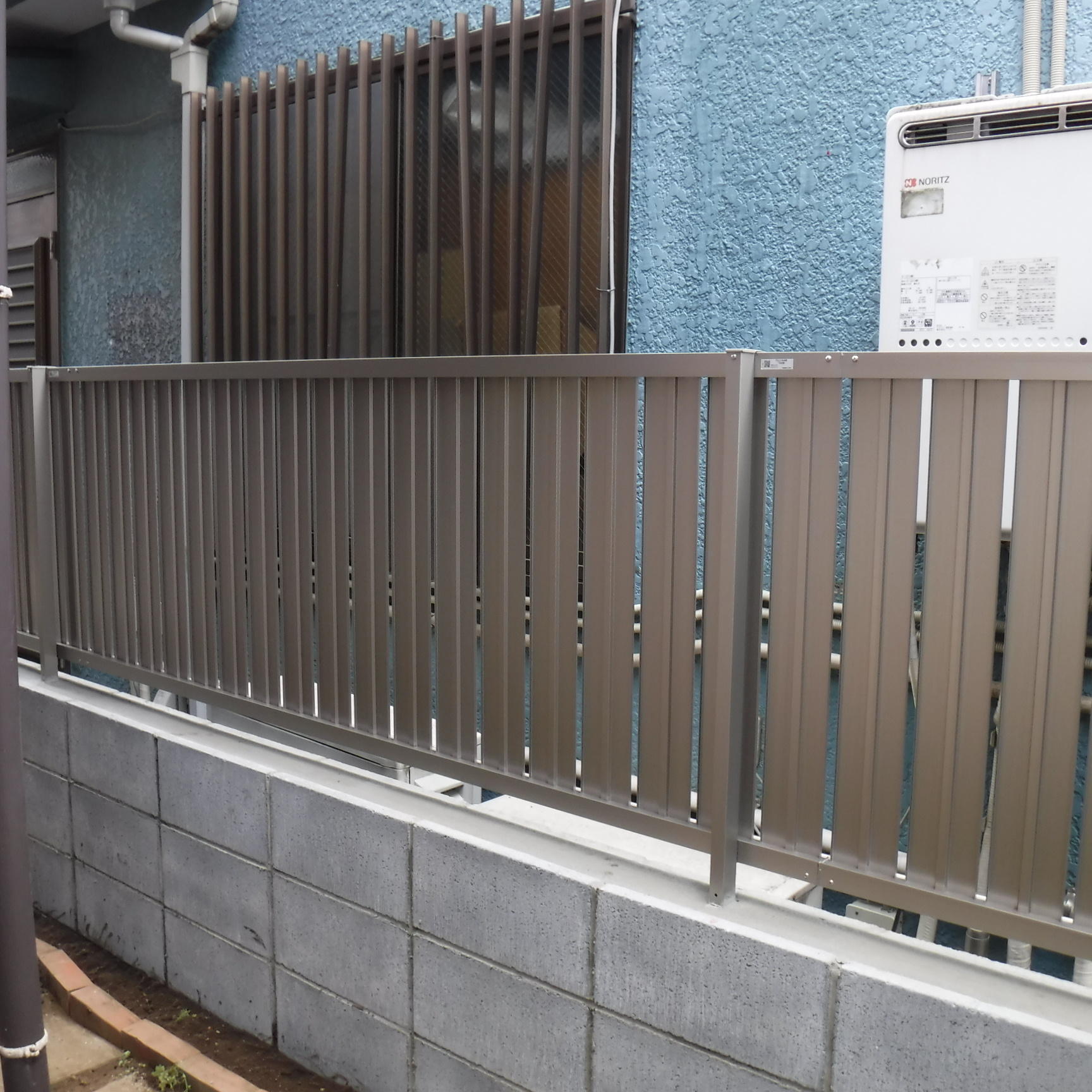 【リフォームのポイント】 隣家の方が地面が高いため、その土圧によって万年塀がご自宅側に傾いていました。土圧に耐える強い塀を希望されていたので、土間コンクリートを打ち鉄筋を配筋し、基礎の上にブロックとフェンスの塀を作りました。