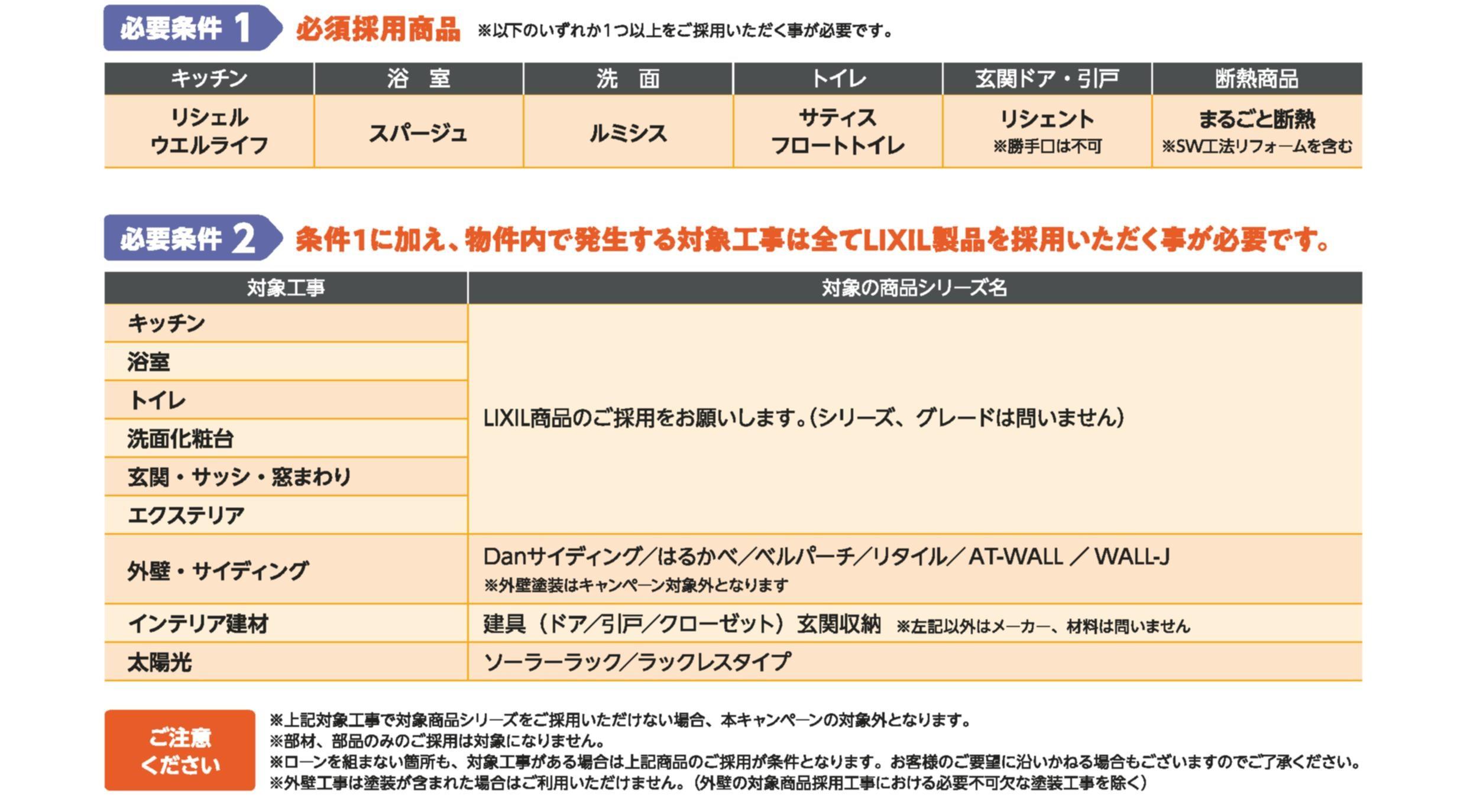今回お申込みのリフォームに含まれる対象工事において、必須採用商品1つ以上のご採用ならびに