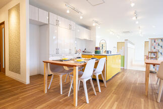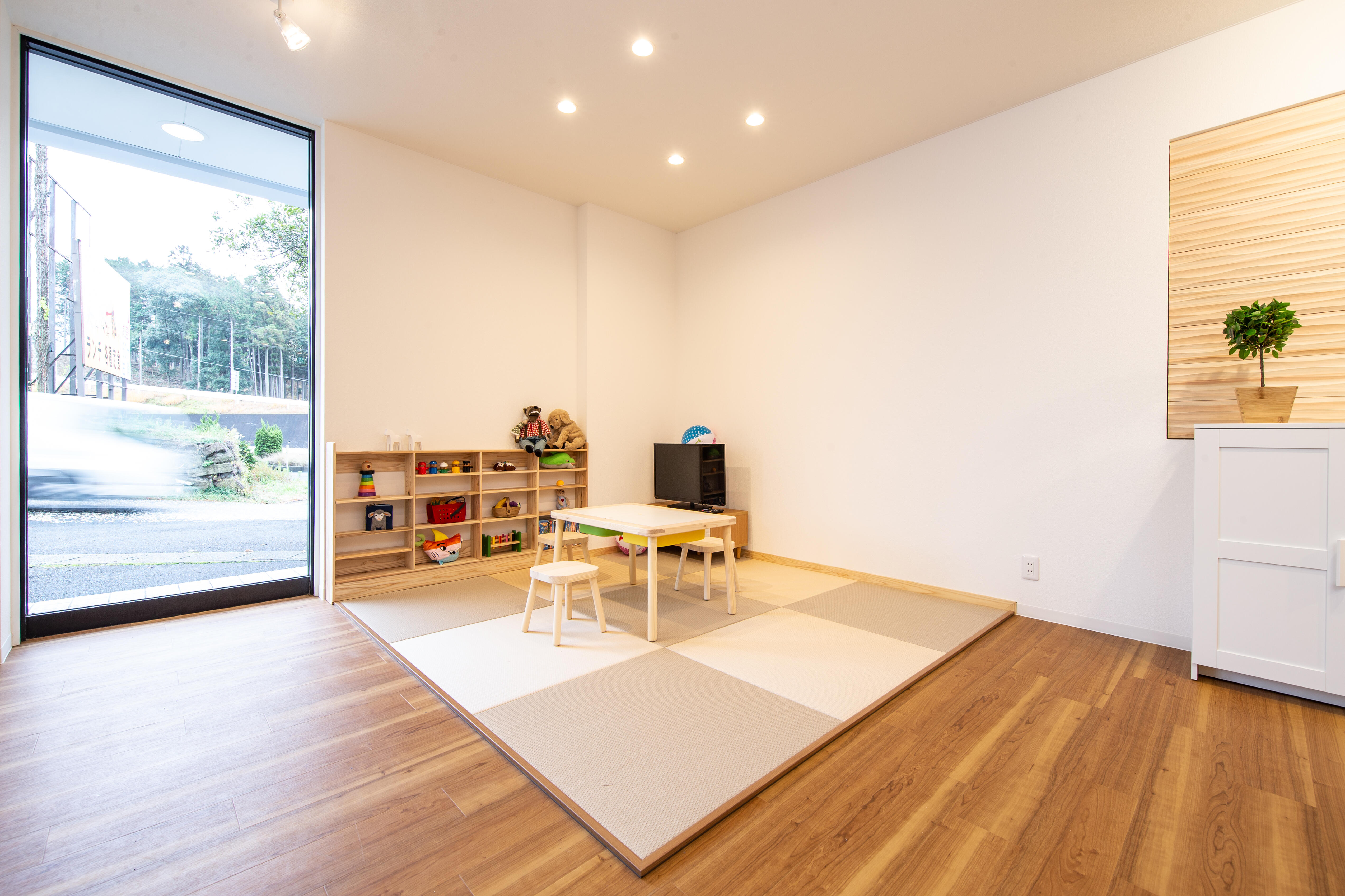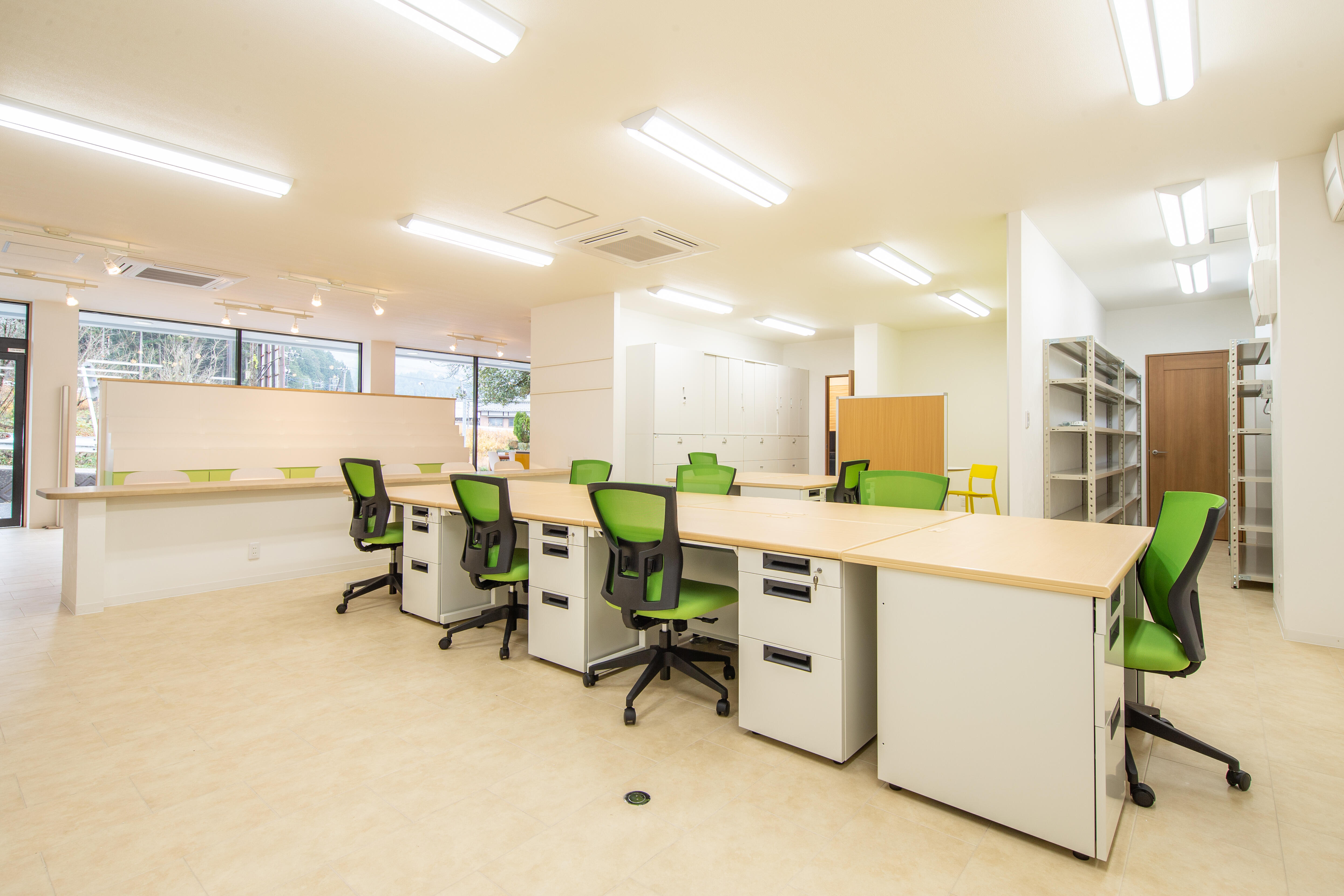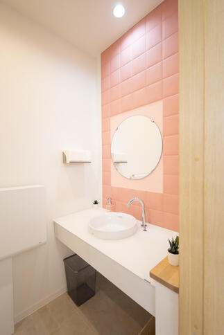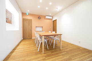 元々コンビニだった建物を、事務所とショールームを兼ねた「リフォームプレイス中津川店」としてリノベーションしました。明るい空間にこだわり、多彩なカラーを随所に取り入れながら、事務所っぽさをなくしたオシャレな雰囲気へと仕上げました。 木材を使ったリフォームも得意であることを知っていただくため、壁に無垢の木を貼り、玄関を入ってすぐの腰壁にはモザイクタイルを合わせています。また、トイレも丸いガラスを使ってユニークな造りに仕上げるなど、遊び心がたくさん詰まった店内となっています。 事務所スペースはオープンな造りになっていますが、契約などの重要な商談を行う際には、引き戸を使って密室空間を作ることができるように工夫されています。イスなどの家具はすべてオーダーで統一しており、事務所とショールームをつなげてイスを並べれば、30人までの会議ができる便利な設計になっています。戸建て住宅やマンションだけでなく、事務所やショールームのリノベーションにも幅広く対応していますのでぜひご相談ください。