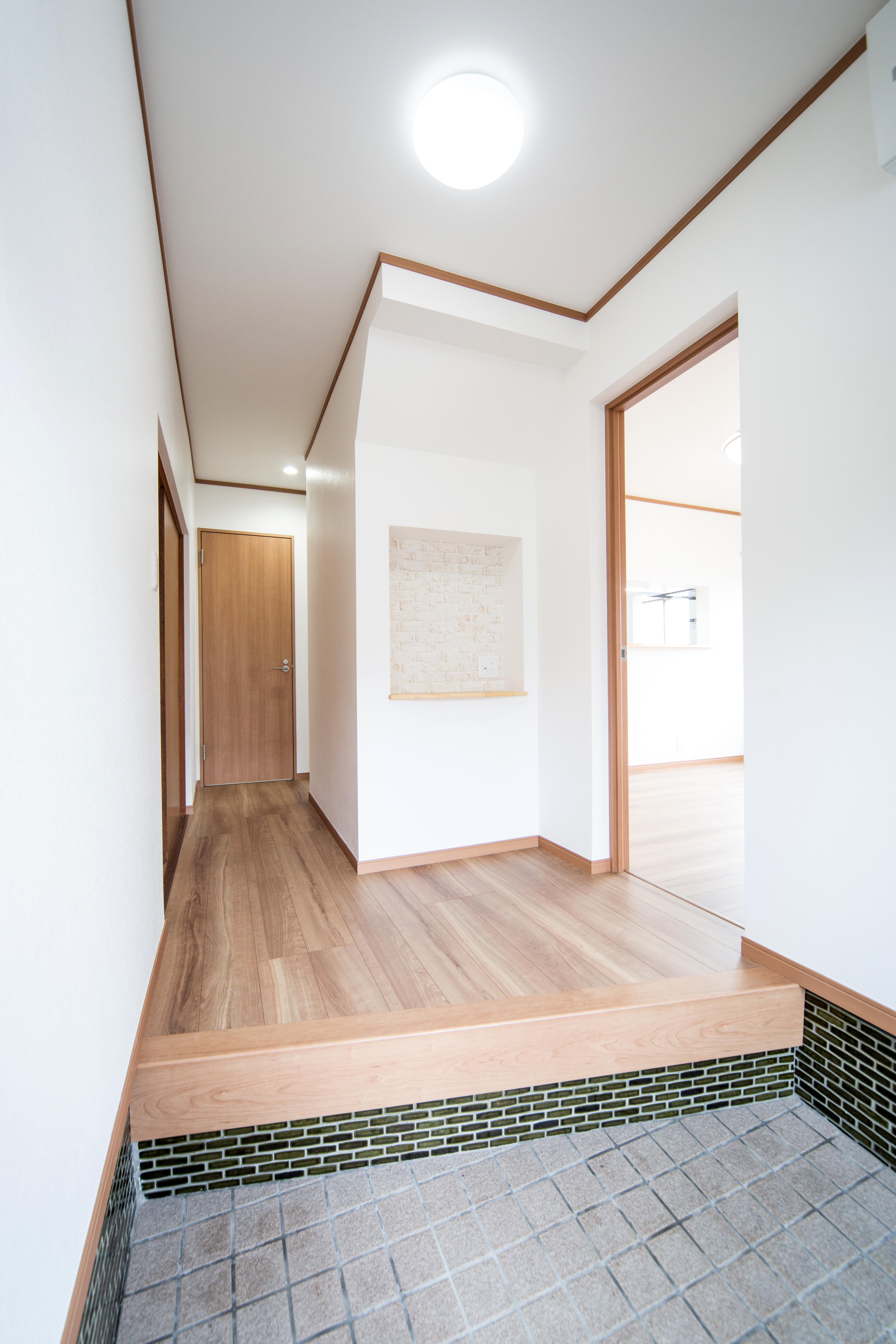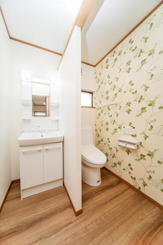 大型犬を飼い始めたのをきっかけに中古戸建てを購入されたというオーナー様からご相談をいただきました。 ワンちゃんと共に暮らす家にリフォームしたいというご希望に加え、お子さんが産まれたことから、家事をしながらでもお子さんに目が届きやすいよう、対面キッチンにしたいというご要望をいただきました。 元々、背面タイプだったキッチンを、対面型のものへと変更しました。 また、洗濯機の置き場がなかったことから、キッチンの一角に設置スペースを設け、料理と洗濯を効率よく進めることができる造りに。さらに、インテリアコーディネートを考えてLDKの壁に白レンガ調のクロスを張り、フローリングにはペット対応の丈夫な素材を採用することしました。 限られた空間をできる限り有意義に使えるようにご提案させていただきました。 玄関を入ってすぐの場所に飾り棚を設けたり、広々としたトイレ空間にしたりと、今後の生活を見据えてさまざまな工夫を凝らしました。また、2階はほとんど手を付けず、生活の中心である1階をメインにリフォームすることで、価格を抑えながら快適な住空間を実現しました。