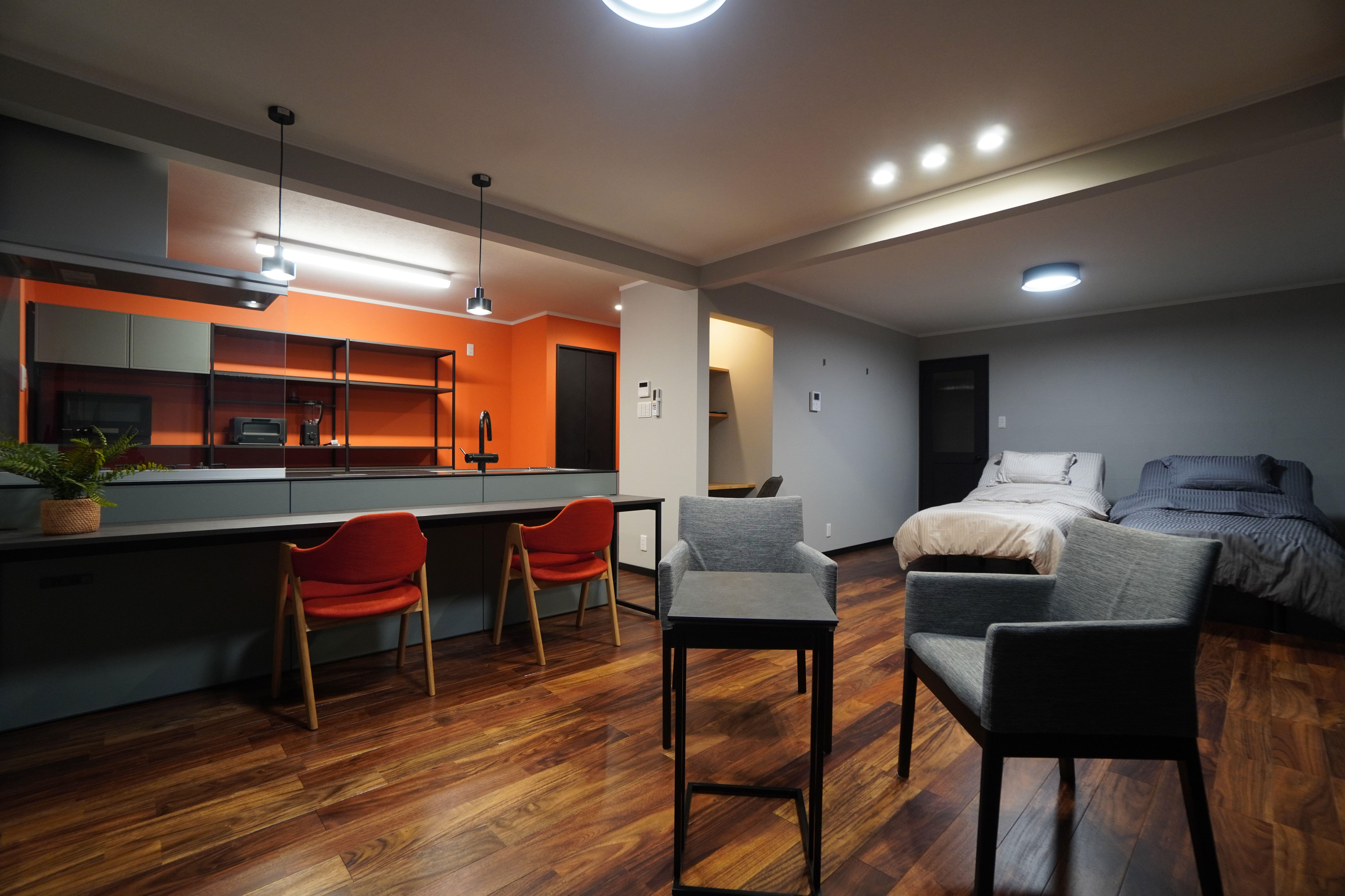 1階は、キッチン・リビング・寝室・洗面をゆるやかにつなぎ、一室空間で完結する“快適なワンルーム”。木のぬくもりを活かした無垢材のフローリングや、造作のダイニングカウンターなど、ホテルライクで居心地のよい空間を目指しました。ライフスタイルの変化に応じて、住まいもまた自由であるべきという考えから生まれた設計です。