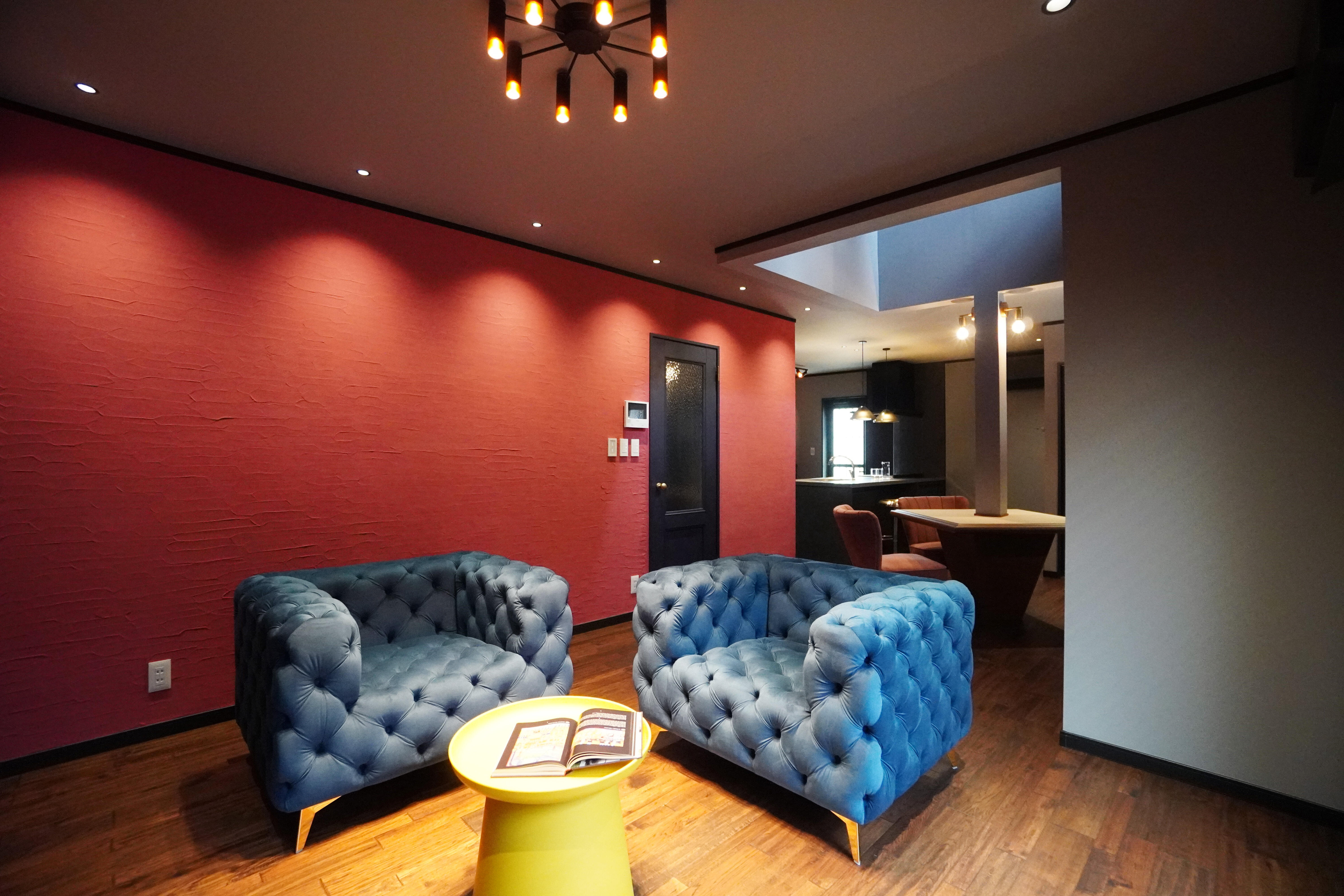 青いソファと黄色いテーブルが象徴的なリラックスエリア、吹き抜けと特注テーブル、暖炉で構成された中心エリア、そしてブラックとステンレスでまとめたキッチン。それぞれ独立した個性を持ちながらも、空間全体で絶妙な調和を保っています。