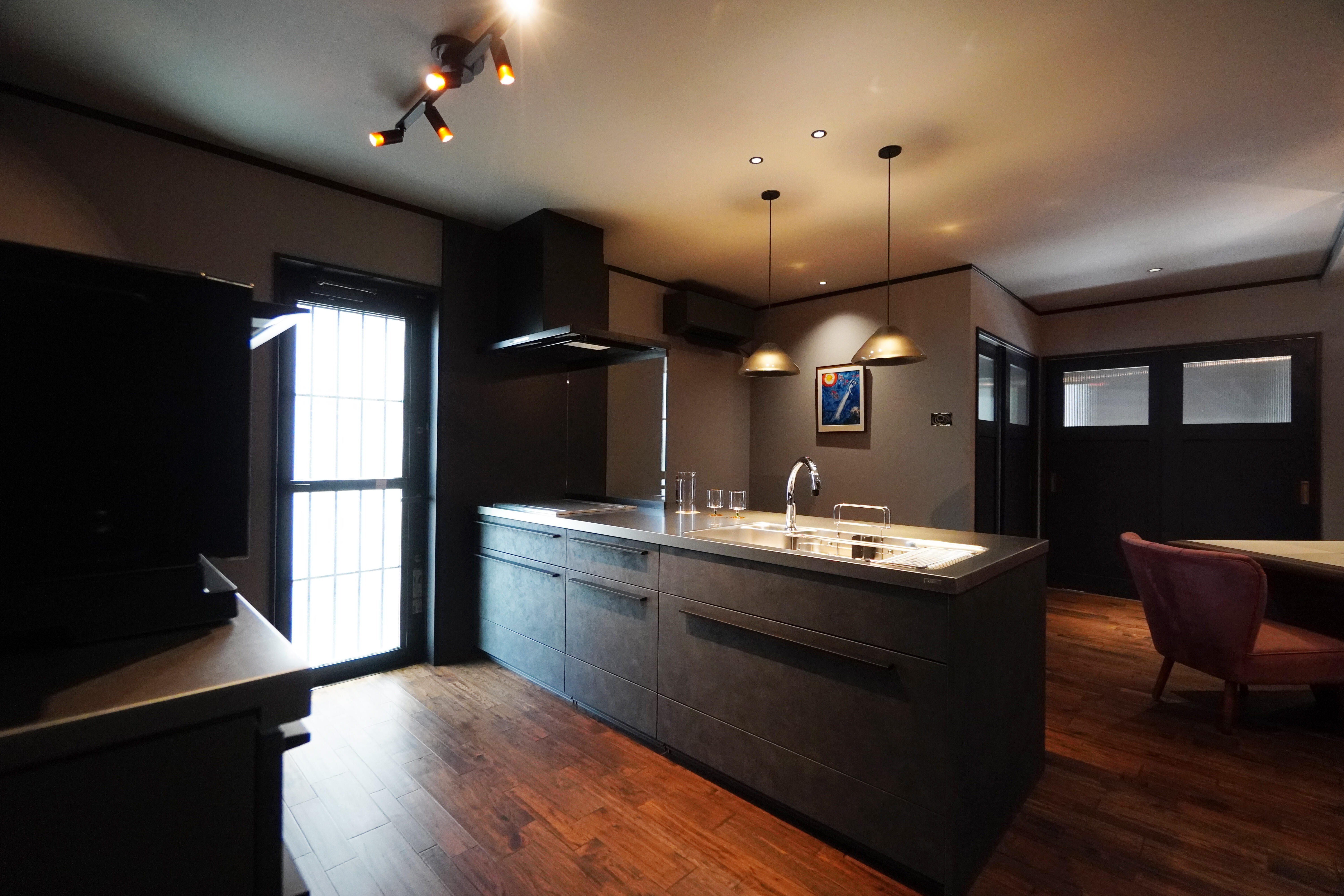 設計コンセプトは「影と光が導く家」。朝はカウンターで朝食をとり、日中は外で過ごし、夜は暖炉の前で食卓を囲み、ソファでくつろぎ、眠りにつく。忙しさに追われるなかで見失いがちな当たり前の暮らしを、もう一度丁寧に味わい、自分の人生を満喫する。そんな豊かさを取り戻すため、あえて明るい色を避け、日中も照明をお好みで調整し落ち着いた空間を演出しました。
