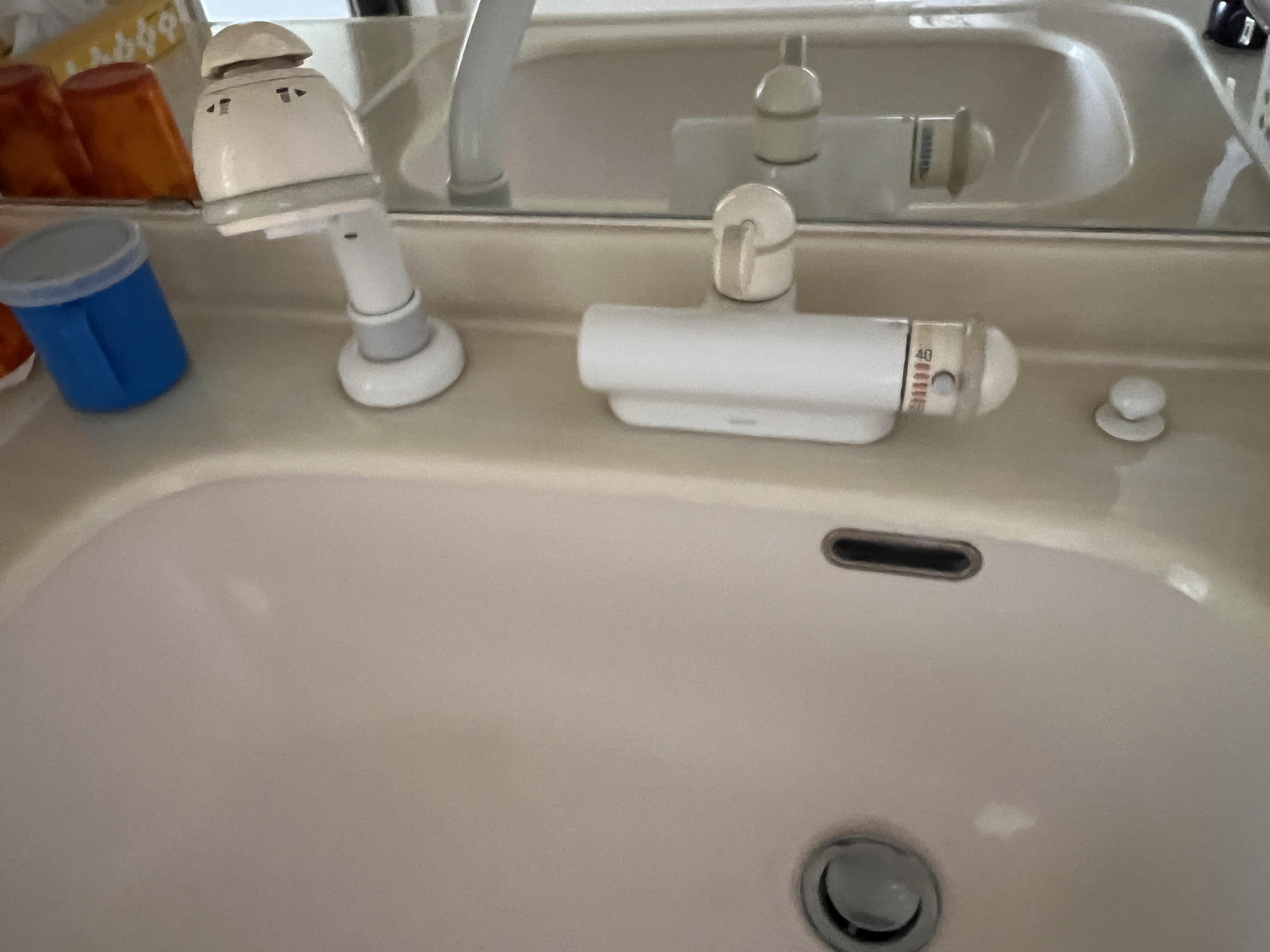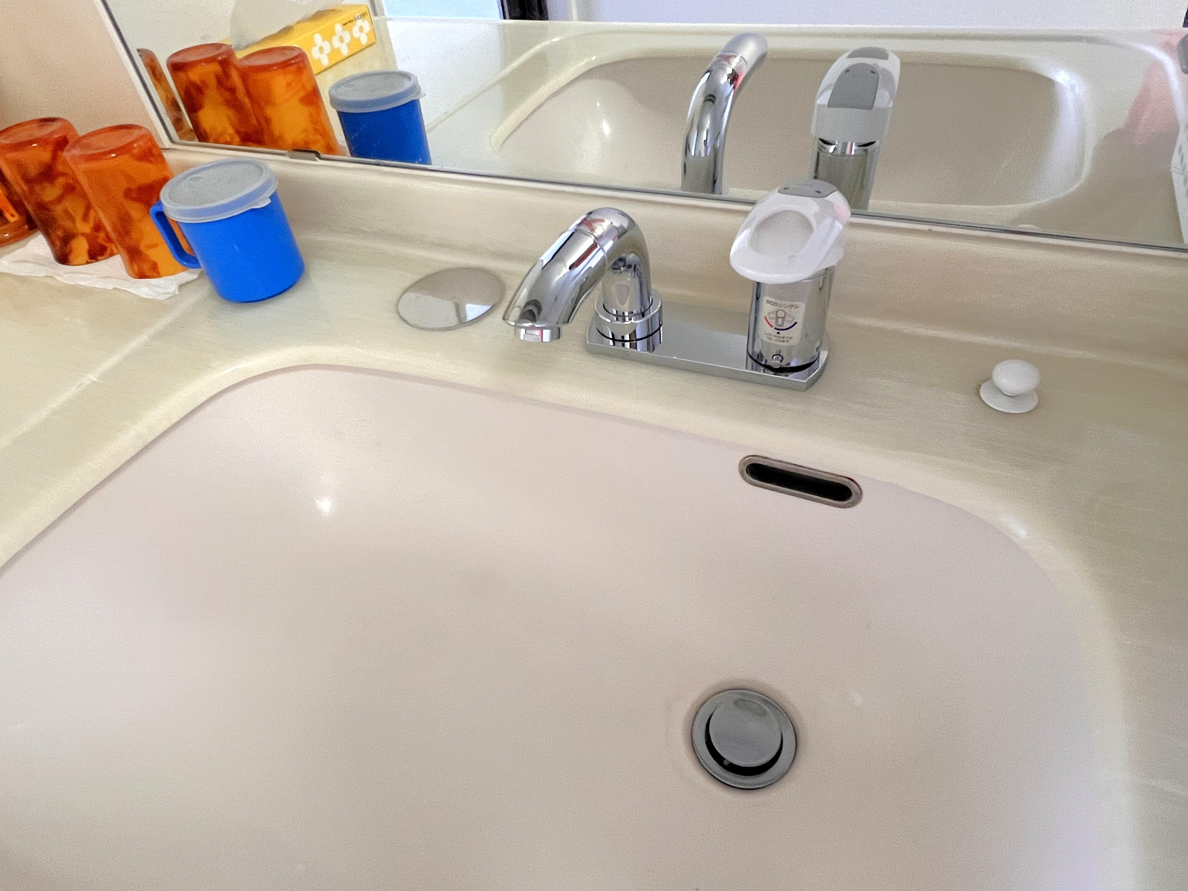 洗面台の水栓金具をお取替えしました。 元々の開口穴は化粧プレートで塞ぎました。 (参考工事価格 約5万円)