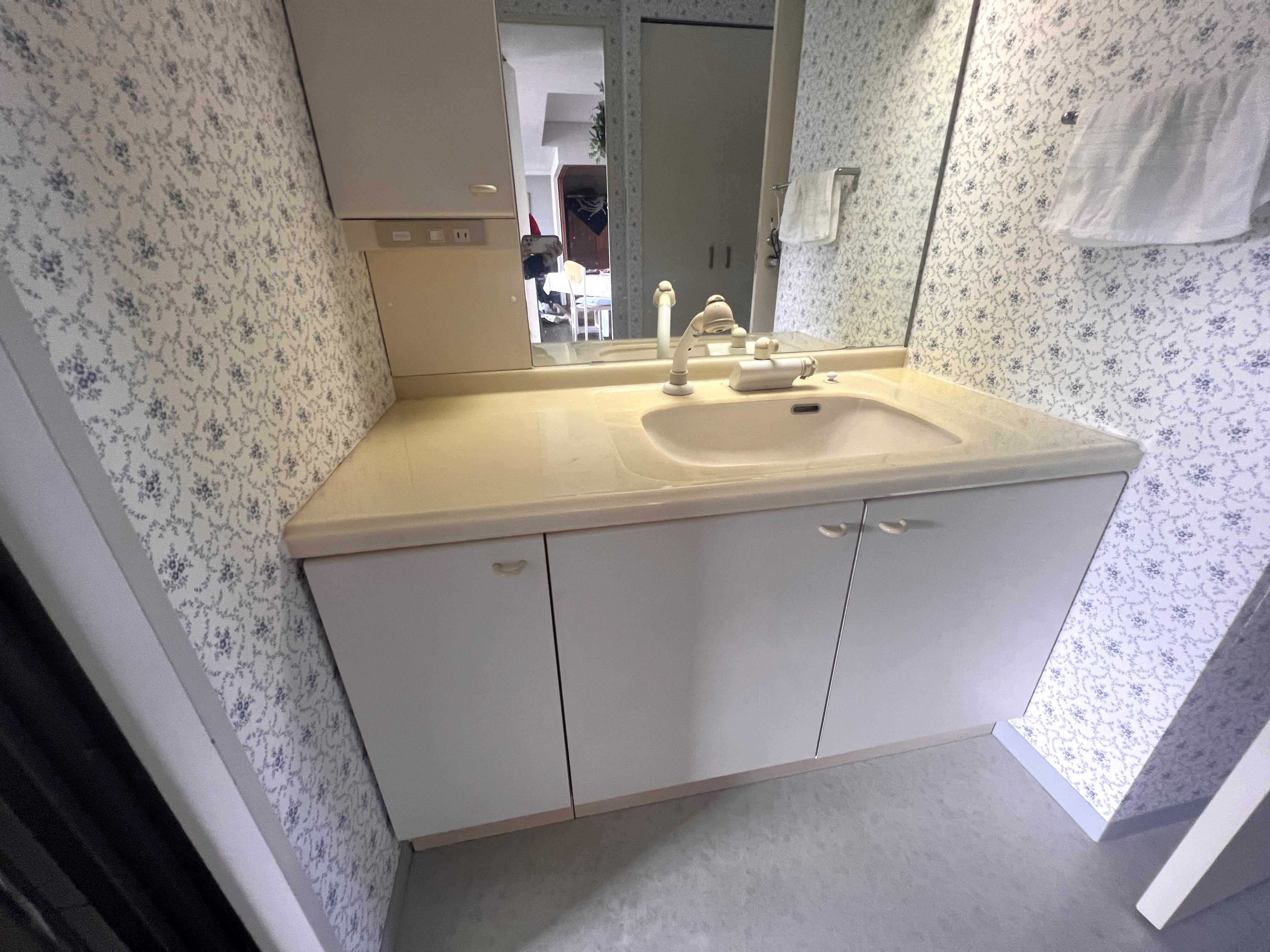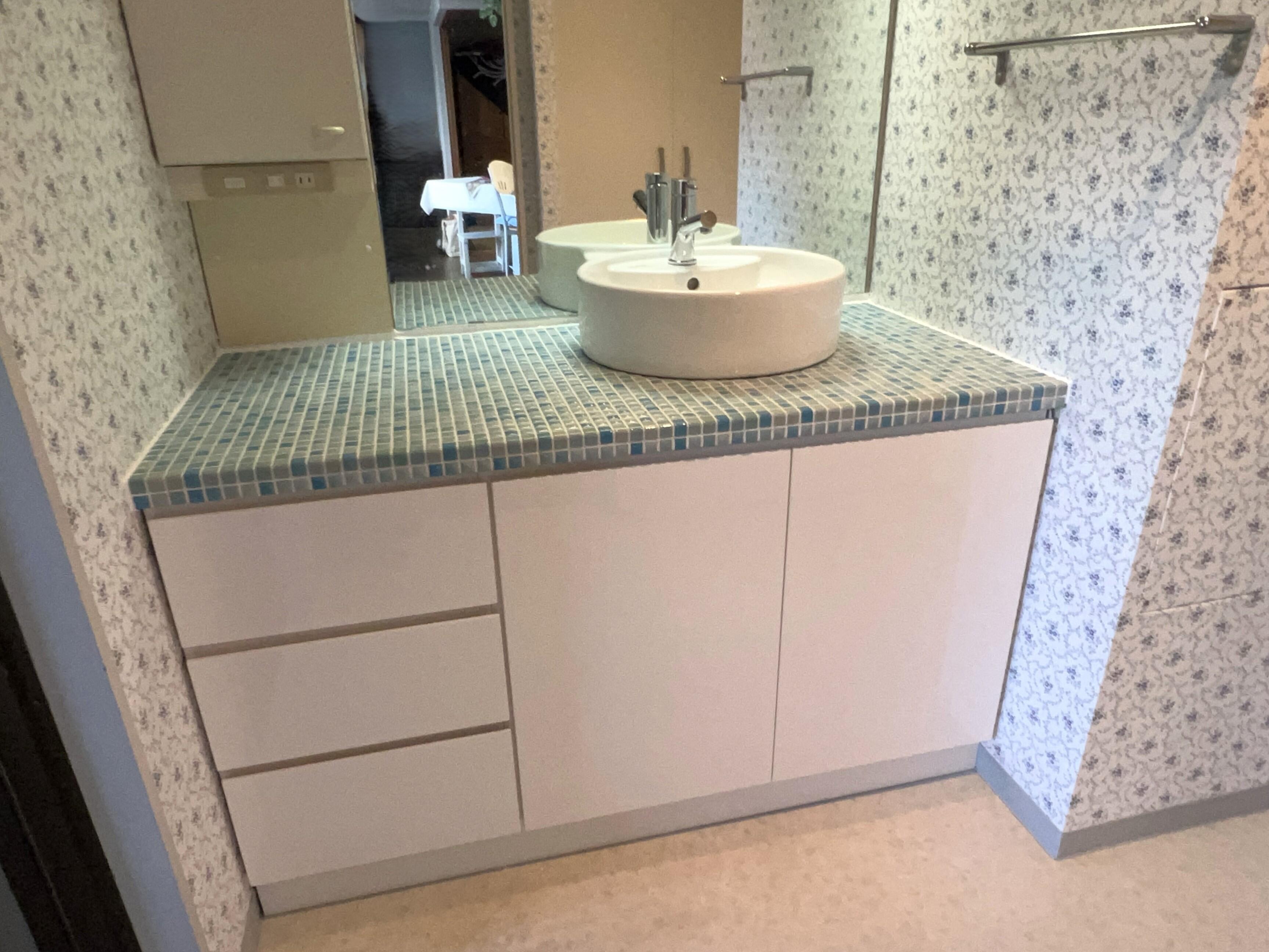 水栓の温度設定が故障がきっかけで、洗面化粧台をお取替えしました。 今回は自分に合う高さと収納を可能にする、造作化粧台。 天板はタイルを貼り、ブルーのタイルが目をひくオンリーワンの空間となりました。