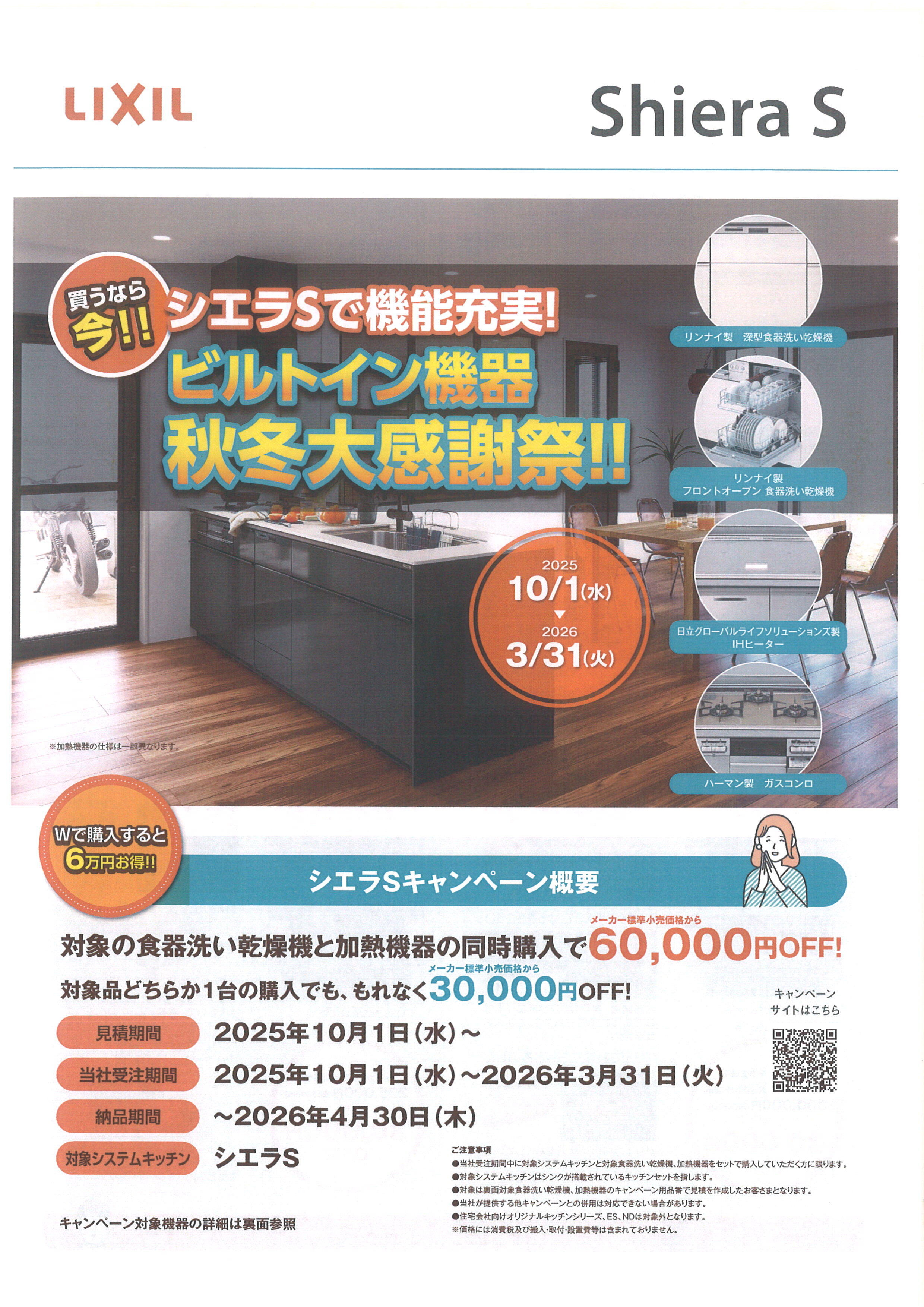 対象のビルトイン食器洗い乾燥機と加熱機器を同時購入すると、なんと最大60,000円OFF!