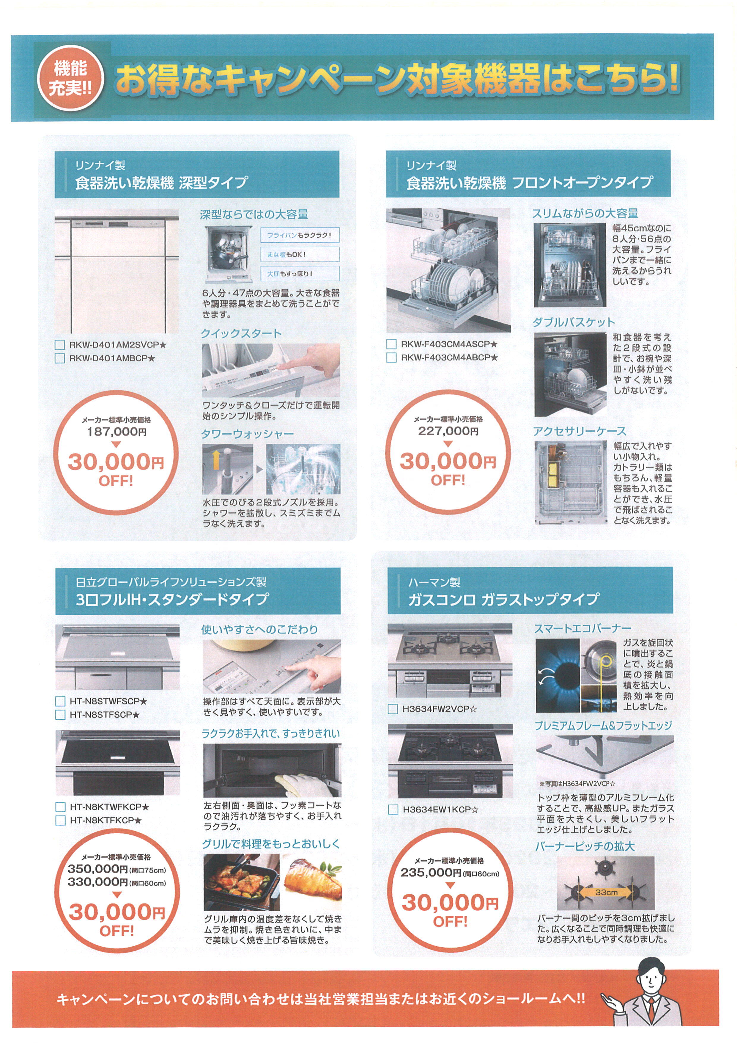 対象商品:リンナイ製食器洗い乾燥機、日立製IH、ハーマン製ガスコンロなど