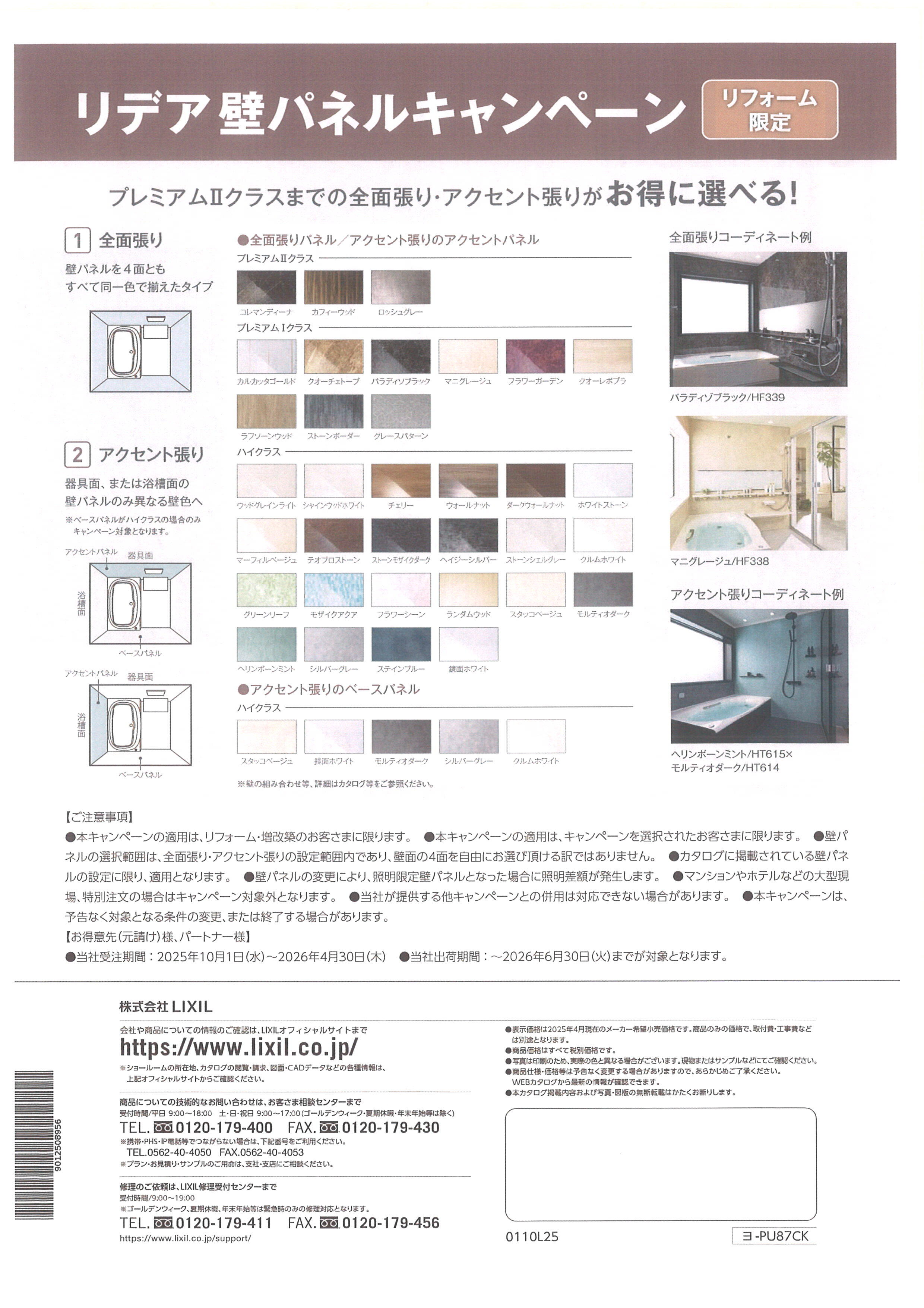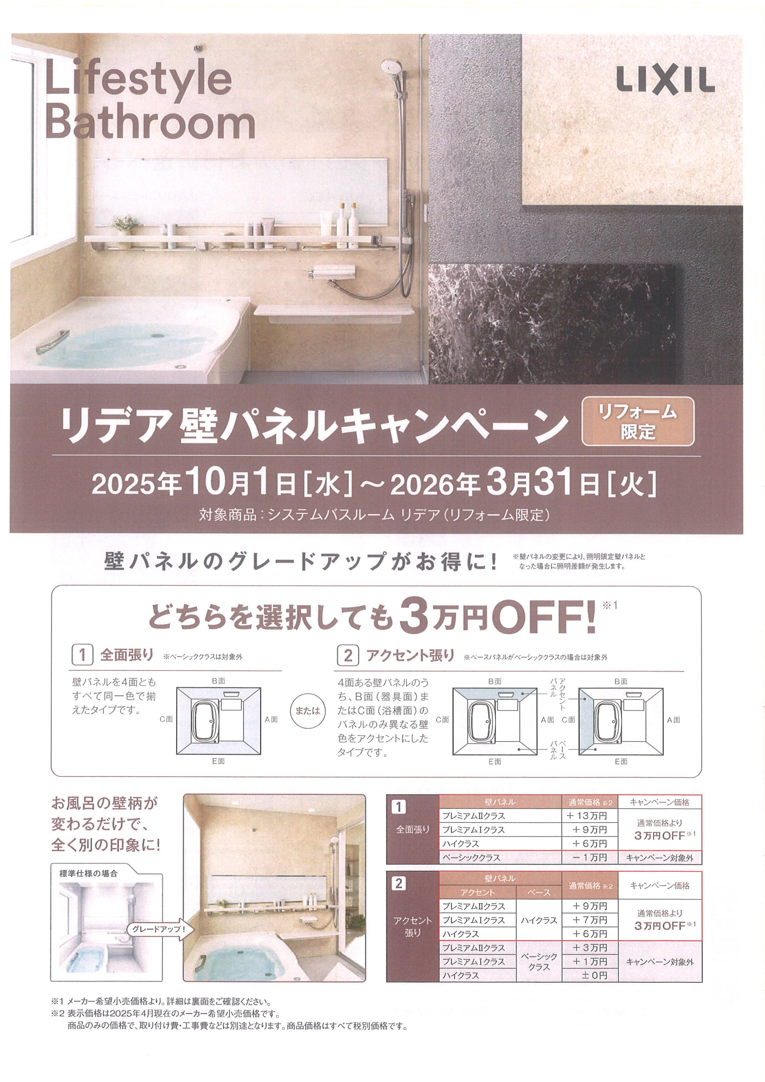 今なら、LIXILの人気システムバス「リデア」の壁パネルをグレードアップすると