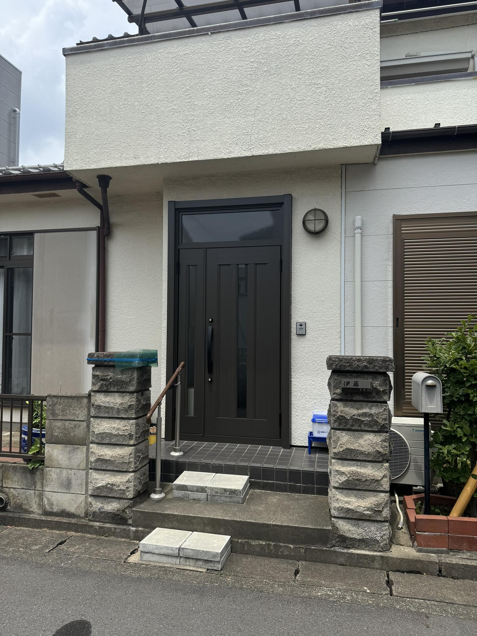 ラッチの不具合が起こってしまいカギの修理でも良かったのですが、綺麗にしたいとのご要望があったのでLIXILリシェント玄関ドアをお勧めしました。