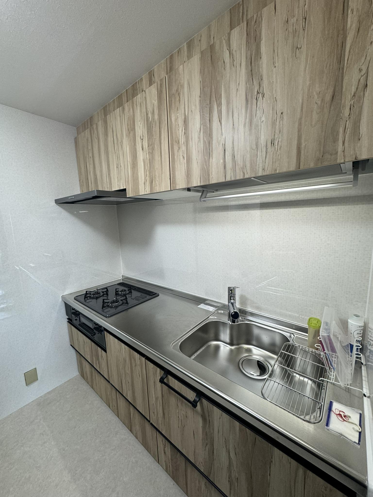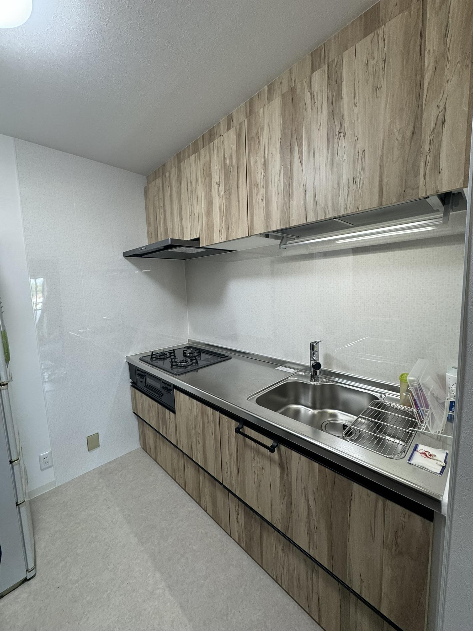 長年使用してきたキッチンを一新しました。 まわりのパネルを撤去することでキッチン間口を50㎜大きくすることが出来ました。