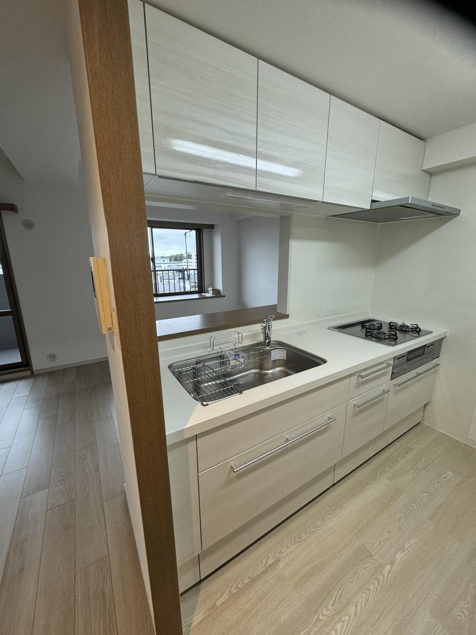 購入されたマンションのキッチンのリフォームを行いました。 キッチンを少しでも開放的にしたいとのご要望から吊戸棚のサイズ小さくして 開口部を広げました。