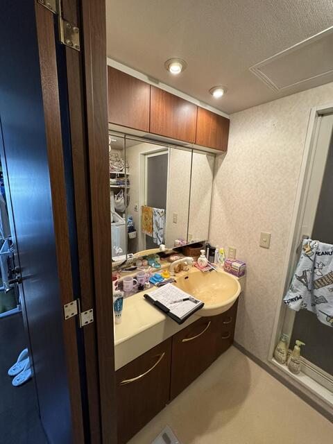 既存の洗面化粧台は経年劣化により、水栓部分の錆や収納扉の傷みが目立ち、