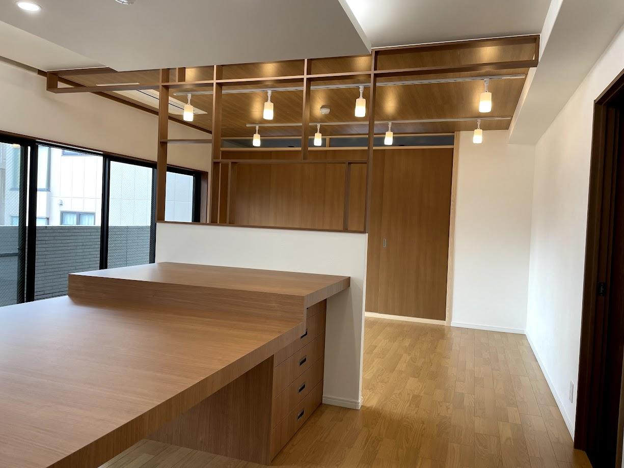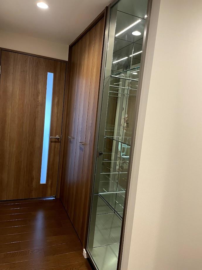 デザイン事務所様からのご依頼で、飲食店舗を経営されているお客様が、ご友人や皆様とホームパーティーが出来るようにとリビングダイニングに別注製作でダイニングテーブルをお造りさせて戴きました。玄関にも趣味の作品を飾れるショーケースも別注で製作させて戴きました。