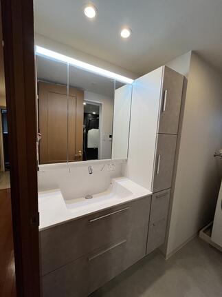 洗面化粧台もタッチレス水栓ナビッシュを採用され、浴室とは違った明るいイメージでメリハリのついた空間になりました。