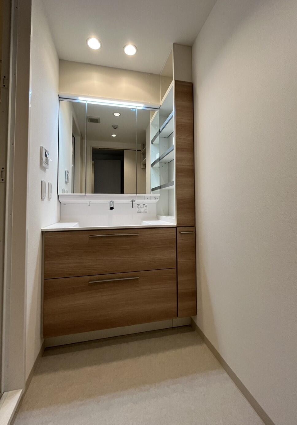 洗面化粧台は既存の横幅と合う商品がお選びのシリーズではなく、大工工事にて、壁を一部ふかして洗面化粧台のサイズと合うように調整させていただきました。