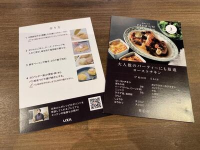 こちらは、最近料理にはまっていまして、ショールームのキッチンコーナーで無料配布してありましたキッチンアンバサダーのタサン志麻さんのレシピカードを頂いてきました。セラミックトップのリシェルで調理するときっとテンションが上がって美味しい料理が作れるでしょうね。