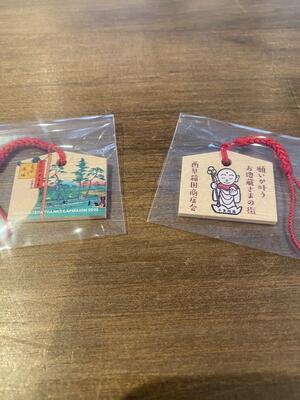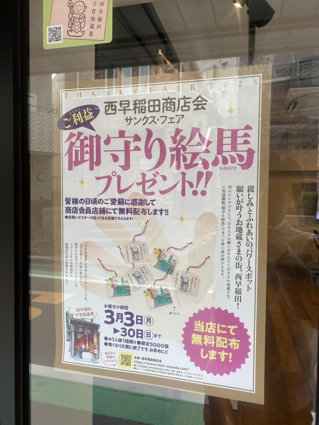 そして街路灯リニューアルを記念し、西早稲田商店会サンクスフェアと銘打ってご来店された方全員に(なくなり次第終了となります。)かわいいお地蔵さまのお守り絵馬を無料でプレゼントしています!