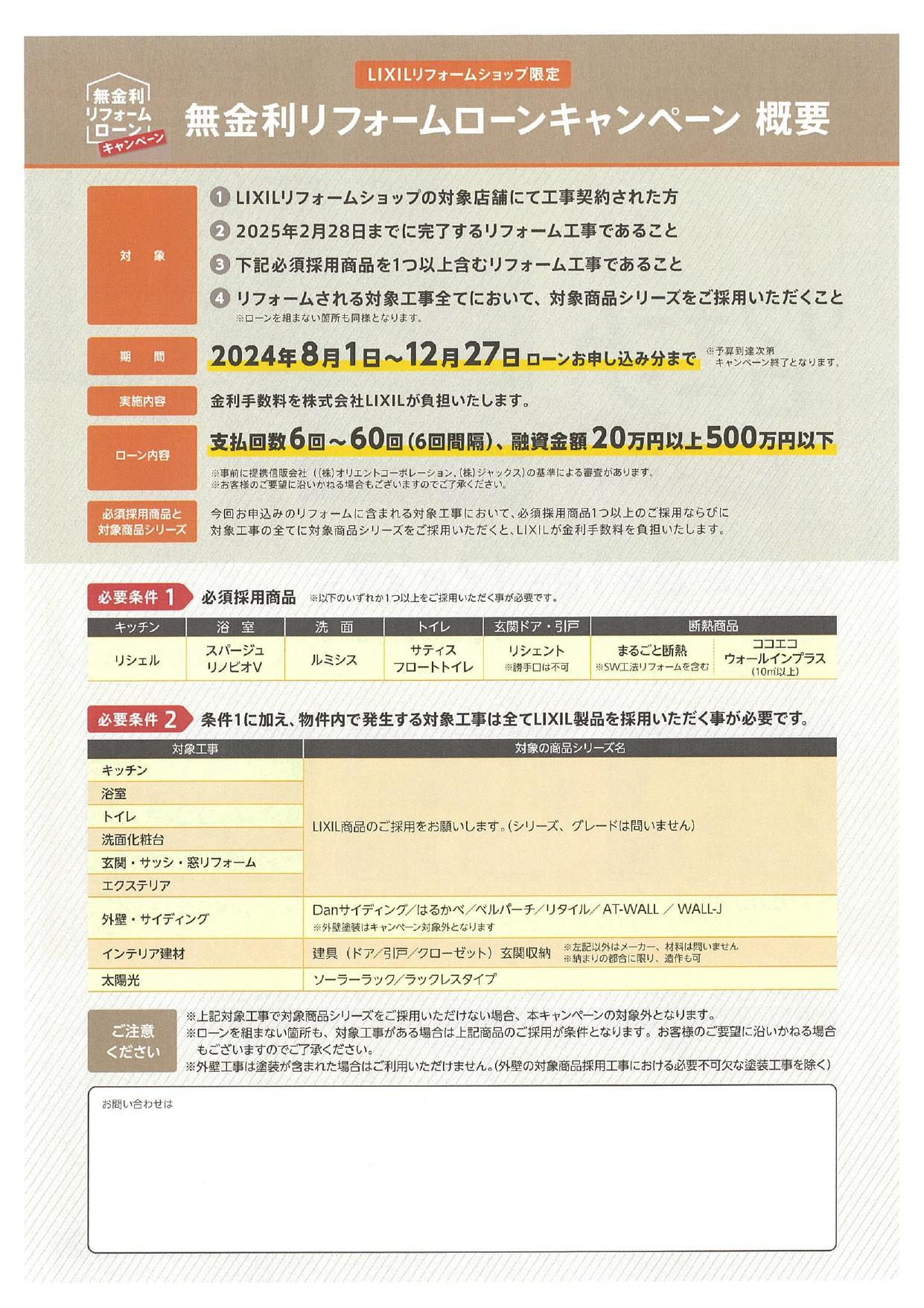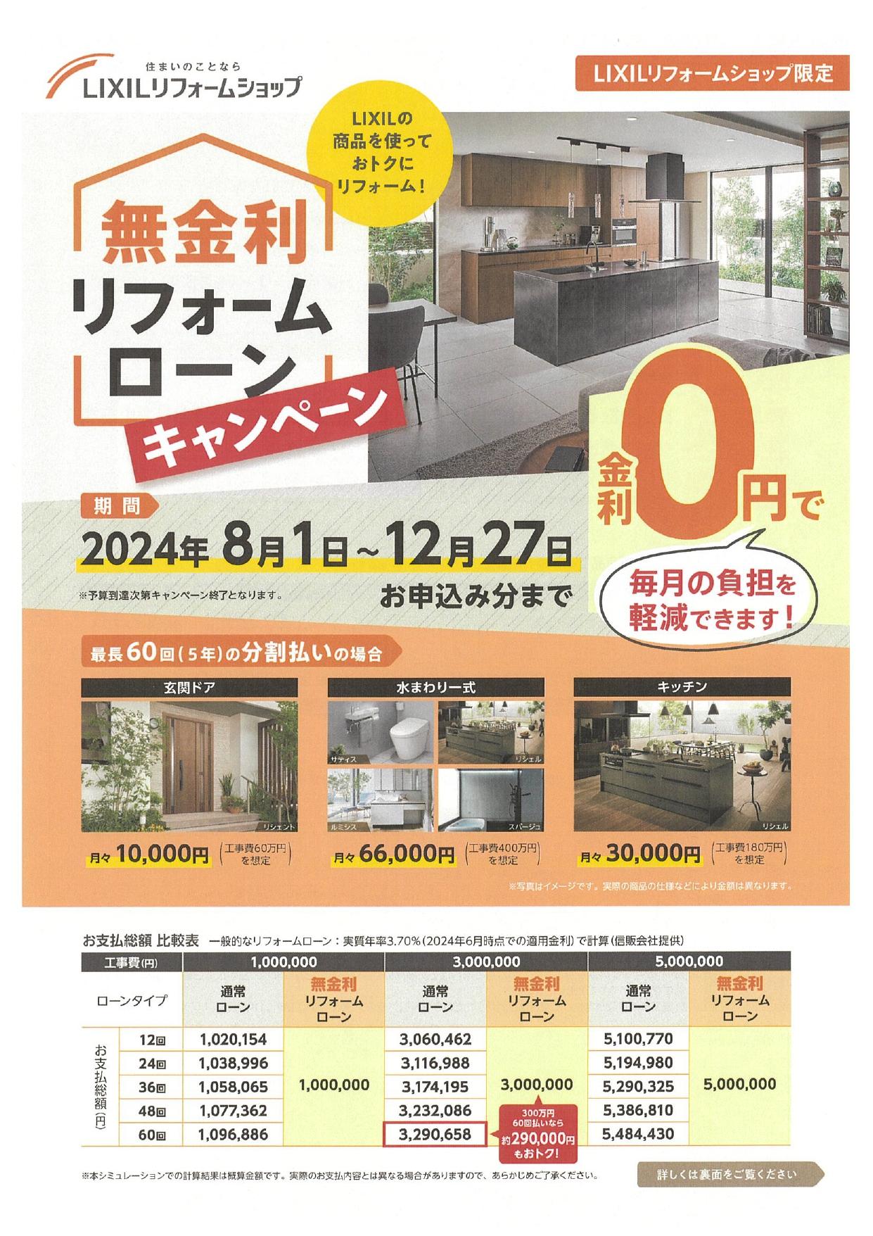無金利リフォームローンキャンペーンがご利用頂けるようになりました。ぜひ住宅省エネ2024補助金キャンペーンと併せてご利用してはいかがでしょうか。