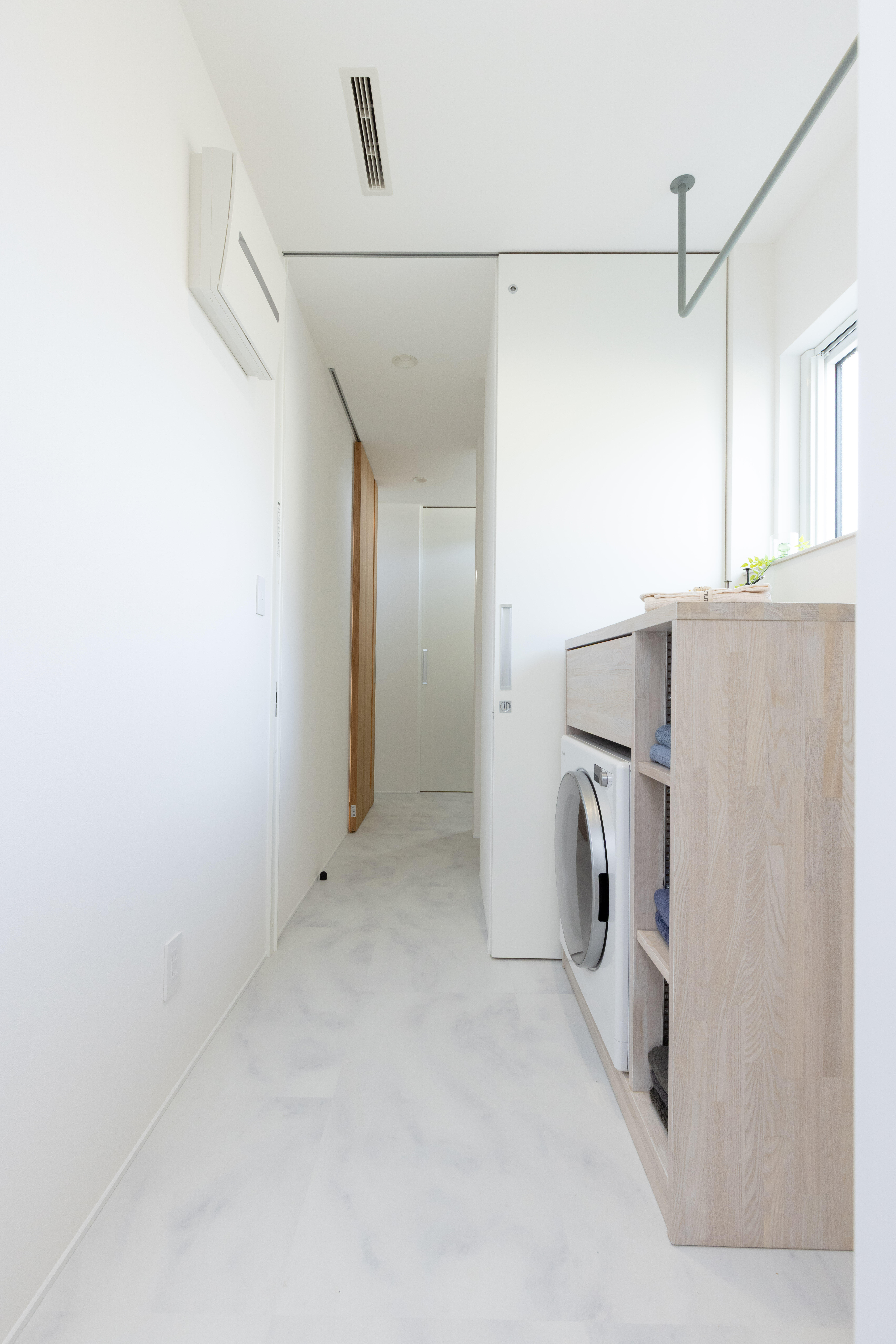 脱衣所の天井にはハンガーパイプが取り付けてあり、天気に左右されずに洗濯物を干すことができます。