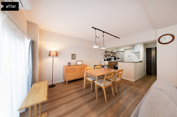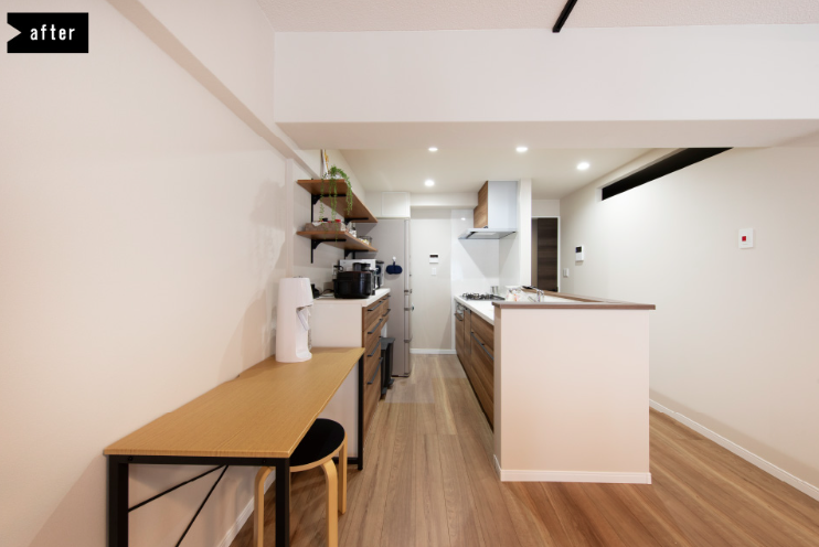 もともとは壁付けのクローズキッチンでしたが、対面式のオープンキッチンにしたことでLDKは広々とした印象に。狭かったキッチンの間口を大きくプランニングすることで、作業スペースも広く使いやすいキッチンに生まれ変わりました。