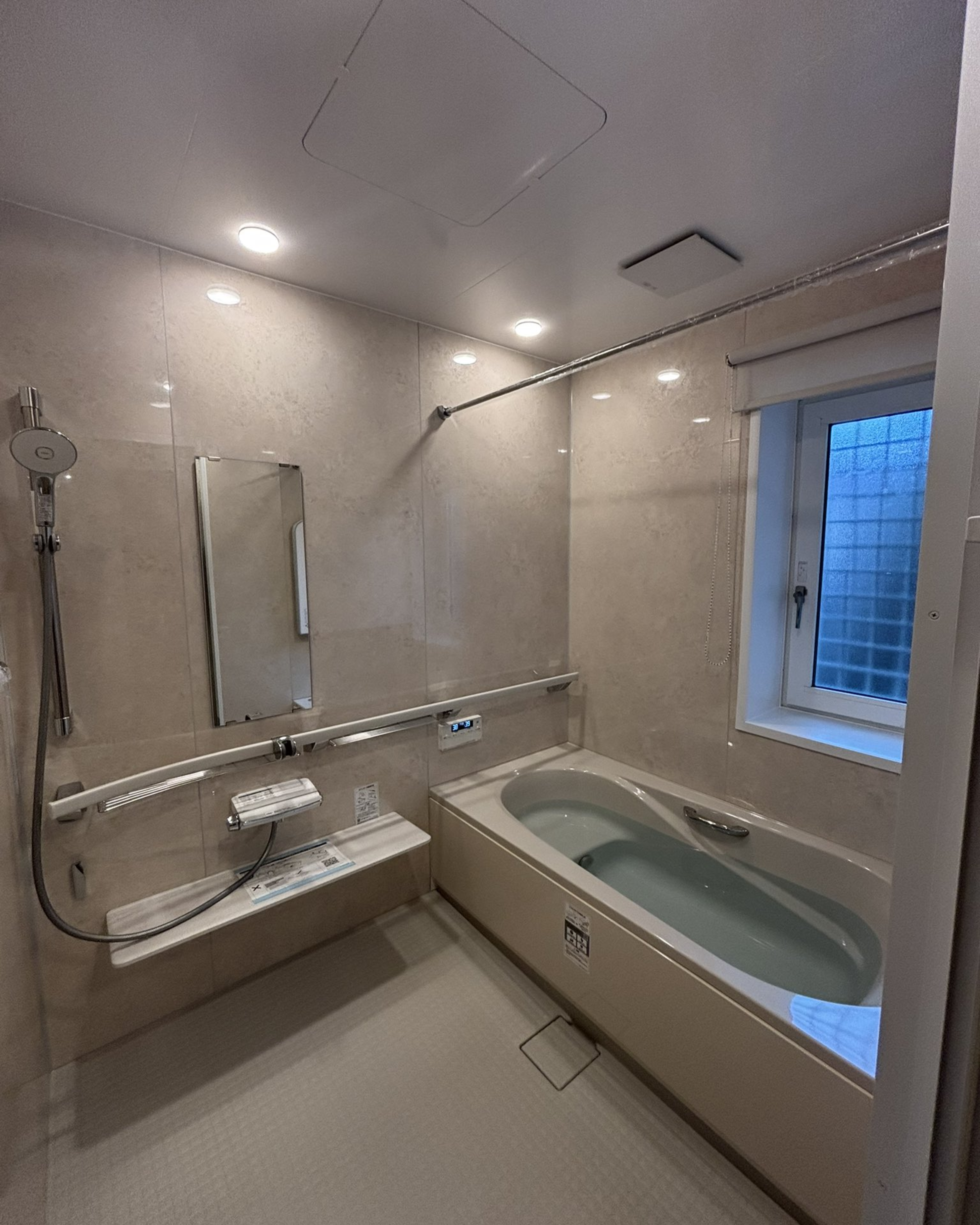 浴室内の動作がしやすくなるよう LIXILのリデアを選択されています。 スマートエスコートバー(鏡の下)が すっきりながら浴室内での動作をサポートしてくれ 快適にお使いいただいているとのことです。