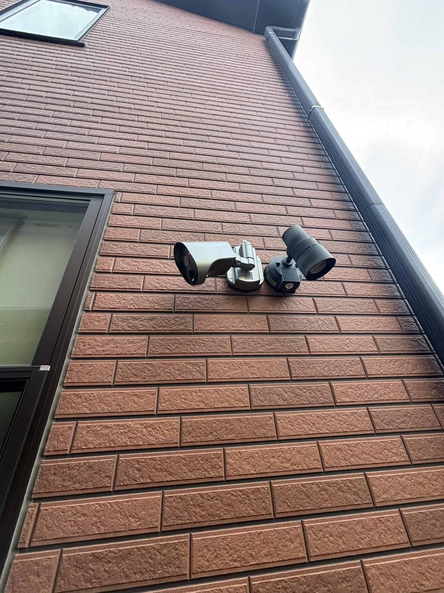 お家の周りの防犯対策に 防犯カメラの設置を行いました さらにセンサーライトの設置で 夜でも人が通ると明るくなり安心です