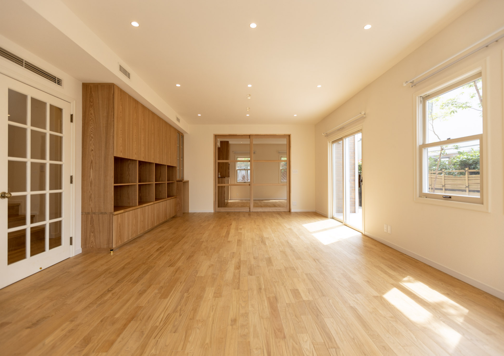 リビングのリフォームを行いました 壁の大きさにぴったりな造作で スッキリとした印象になりました 床は床暖房に変わり、 お部屋との間の開口部には すてきな室内スライドドアが増えて 冬はあったか、夏は涼しいリビングに 仕上がっています