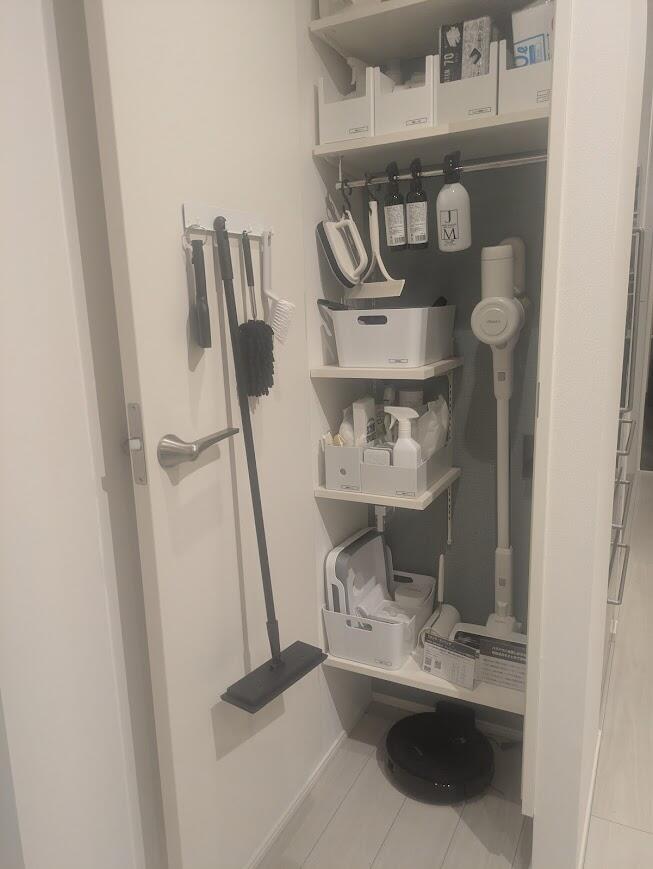 掃除機やモップ、洗剤類がスッキリ一か所に! 「使う場所に収納を作る」という基本が徹底されていて、これなら毎日の掃除も億劫にならずに済みそうです。