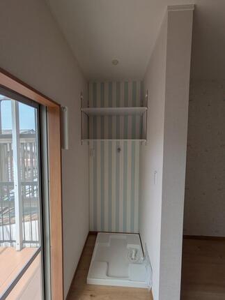 室内洗濯機設置に合わせて、給排水設備やコンセントを新設し、デザインと機能性を両立させたランドリースペースを確保。