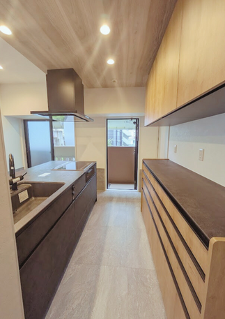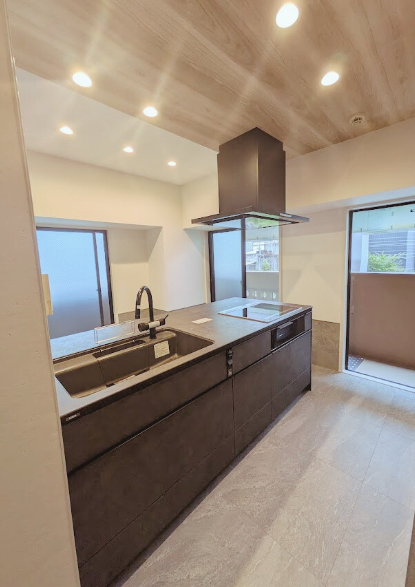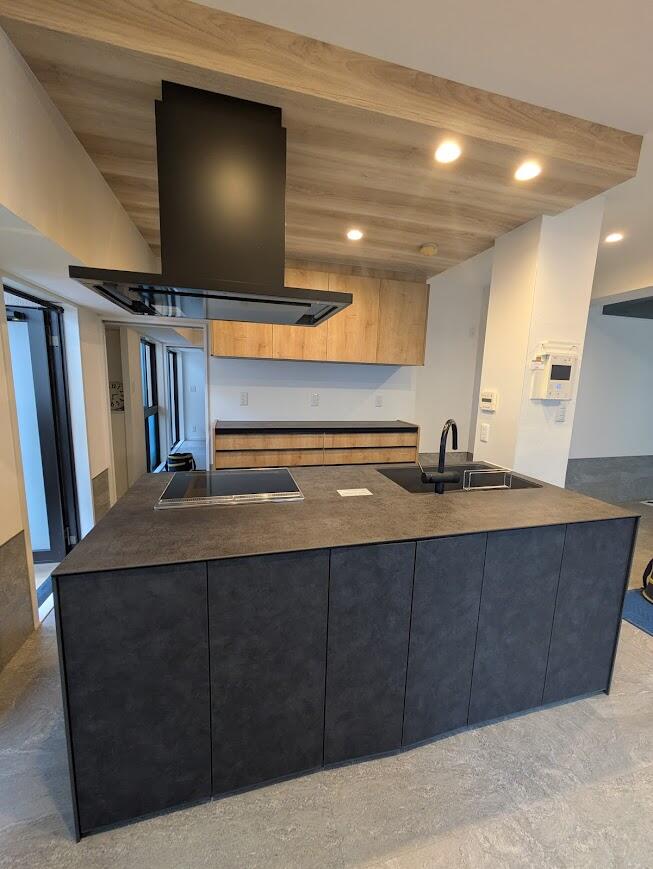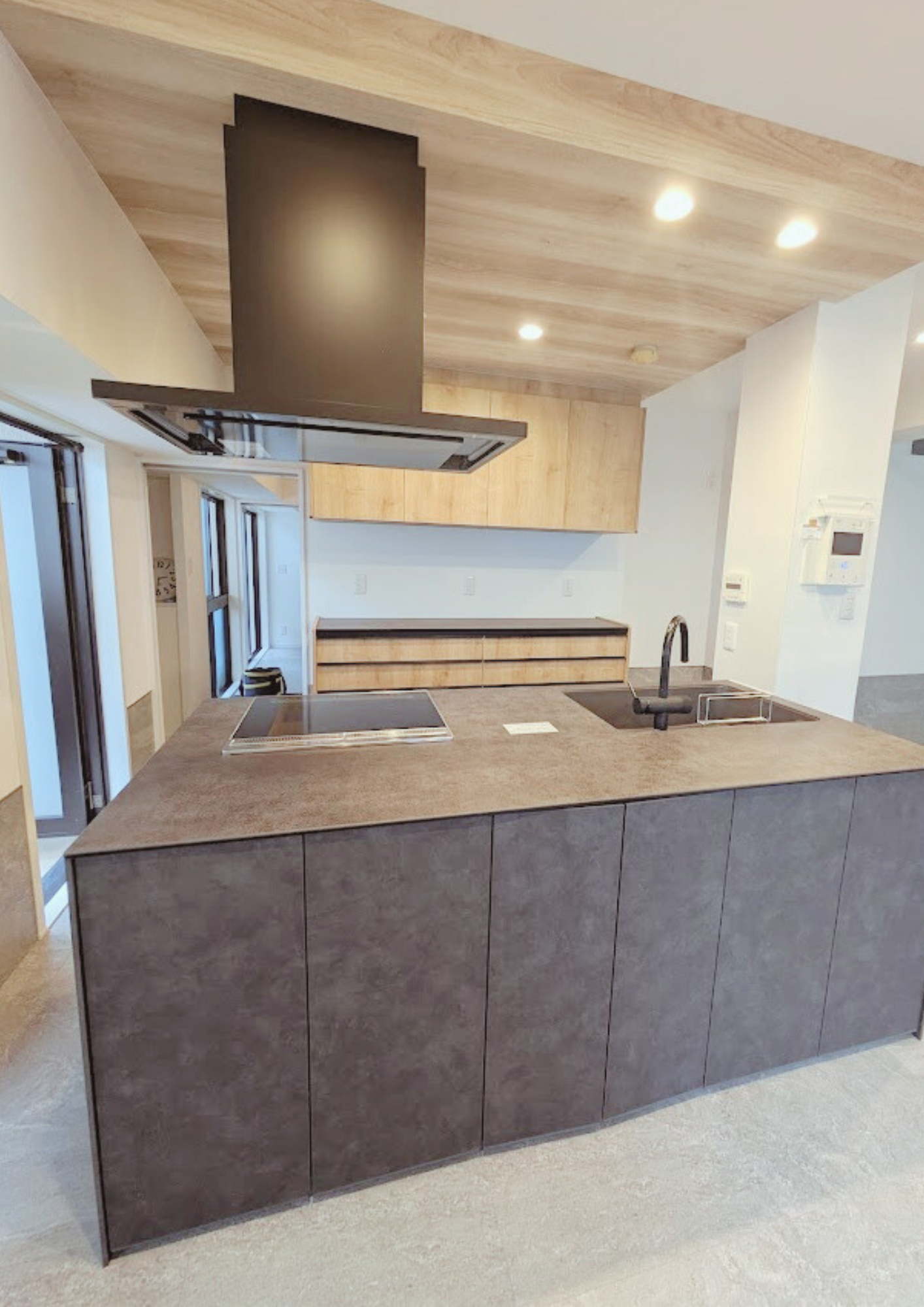 今回のリノベーションで、K様邸のキッチンはLDKの中心となるアイランド型へと生まれ変わりました。 ご採用いただいたのは、LIXILのシステムキッチン『リシェル』。 洗練されたグレーのカラーは、リビング空間との調和も美しく、モダンで上品な印象を与えます。