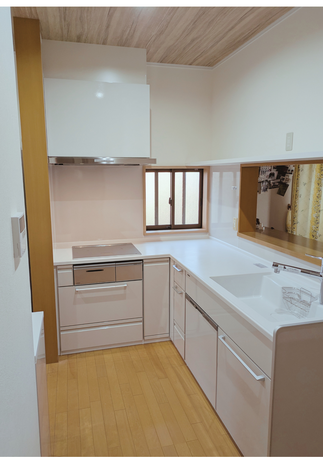 窓枠の補修や内装を一新したことで、キッチン全体がパッと明るい印象に生まれ変わりました。こだわりの一枚棚は、お気に入りの雑貨を飾る見せる収納として、奥様にも大変お喜びいただけました。