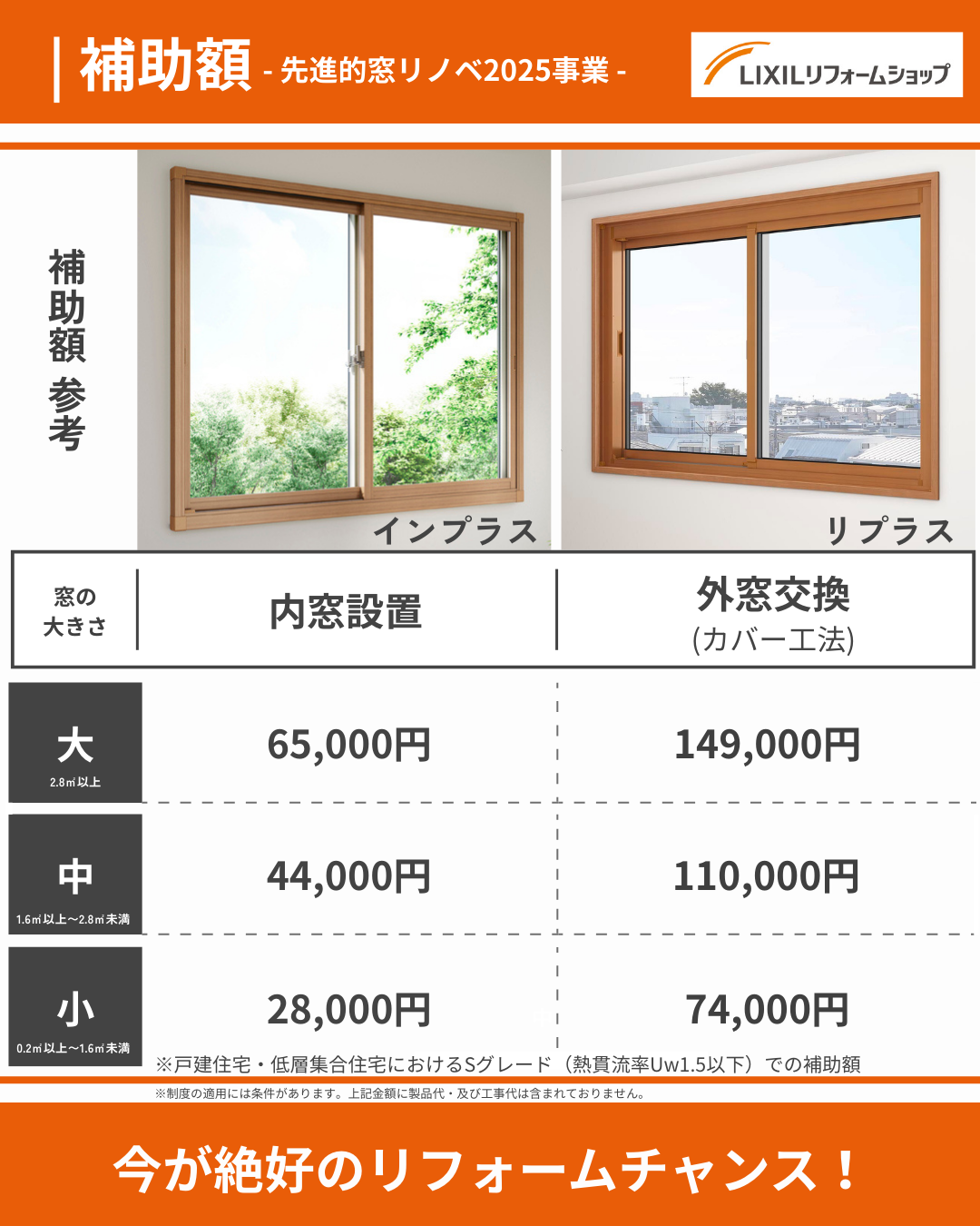 これらの窓リフォームに、先進的窓リノベ2025事業の補助金を使うと、なんと最大50%相当も補助されるんです。![]()