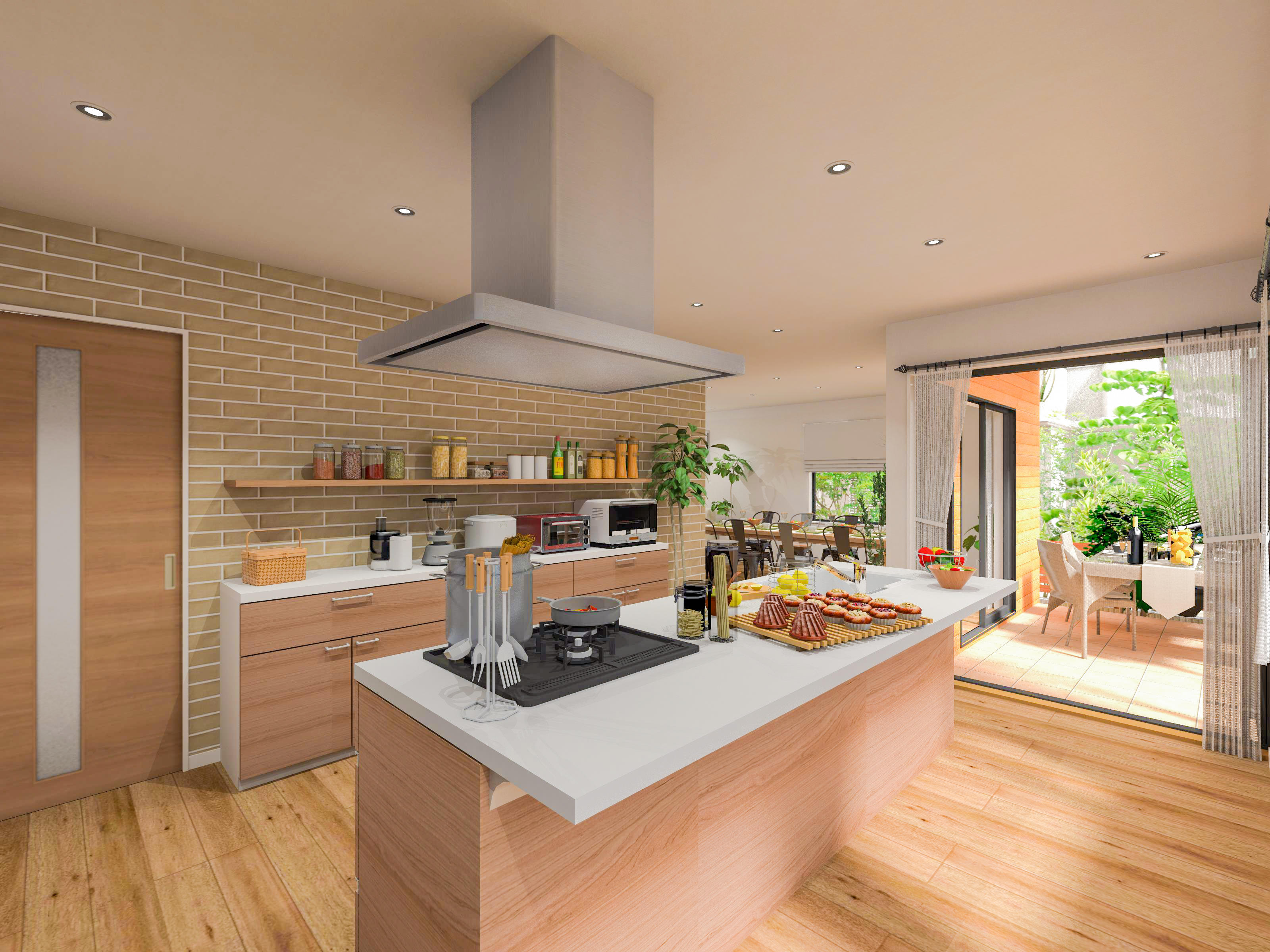 断熱対策をしっかりと行うことで、キッチン・リビング・ダイニングの広い一室空間でも寒さを気にすることなく心地良く過ごせるように。将来、料理教室を始めたときでも、大人数の生徒さんが料理をしたり、食事をしたりする際にも暖かく快適です。