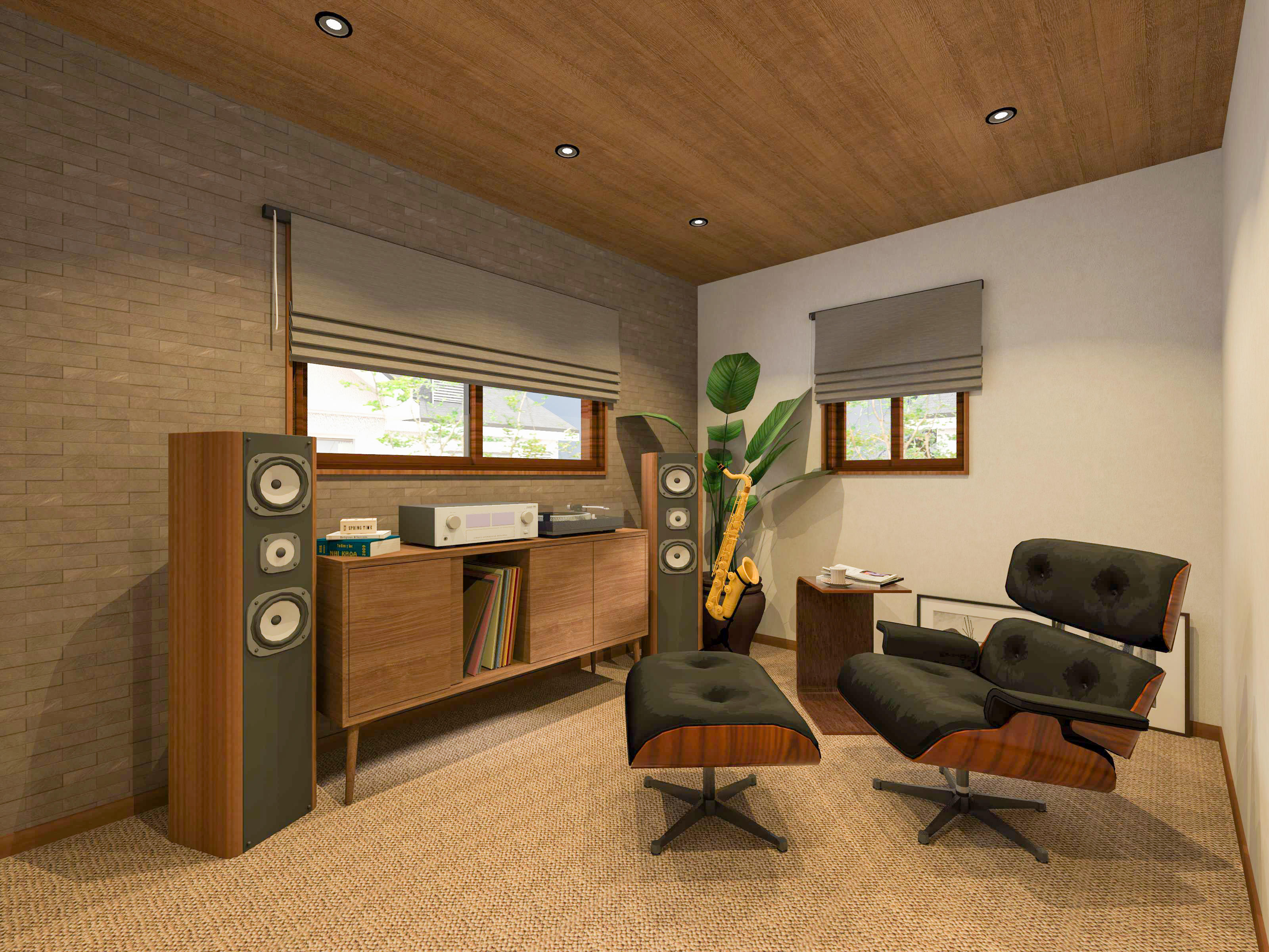 和室だった場所は防音対策をしてオーディオルームに。窓に内窓を設置した他、部屋の入口の扉も二重にしたり、隣室との間に収納を設置して防音効果を向上。音楽を聴いたり、楽器を演奏したり、静かな空間で自分だけの時間を楽しめる場所です。