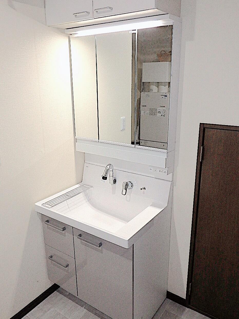 洗面ボウルは底面が広く、衣類のつけ置きや水汲みもしやすくなりました☺ 三面鏡は収納になっており、収納扉の裏にも取り外し可能なポケット付き。 クロスとクッションフロアも張り替え、すっきりキレイな洗面空間に生まれ変わりました✨