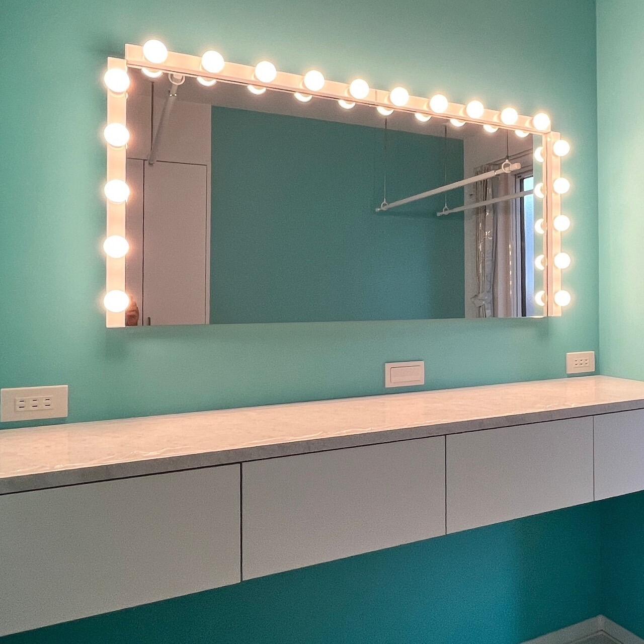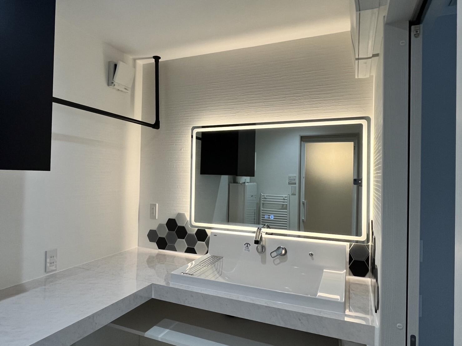 底が広くて大容量のボウルは、水汲みやつけ置きに最適。 つなぎ目や凸凹もないのでお手入れもしやすいです。 女性の多いご家族構成でしたので、照明付きの大きなミラーとカウンター、さらにもう1つお化粧台も作りました。
