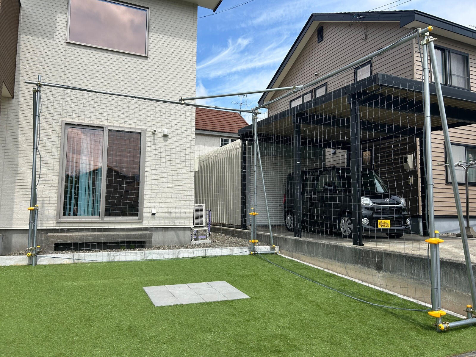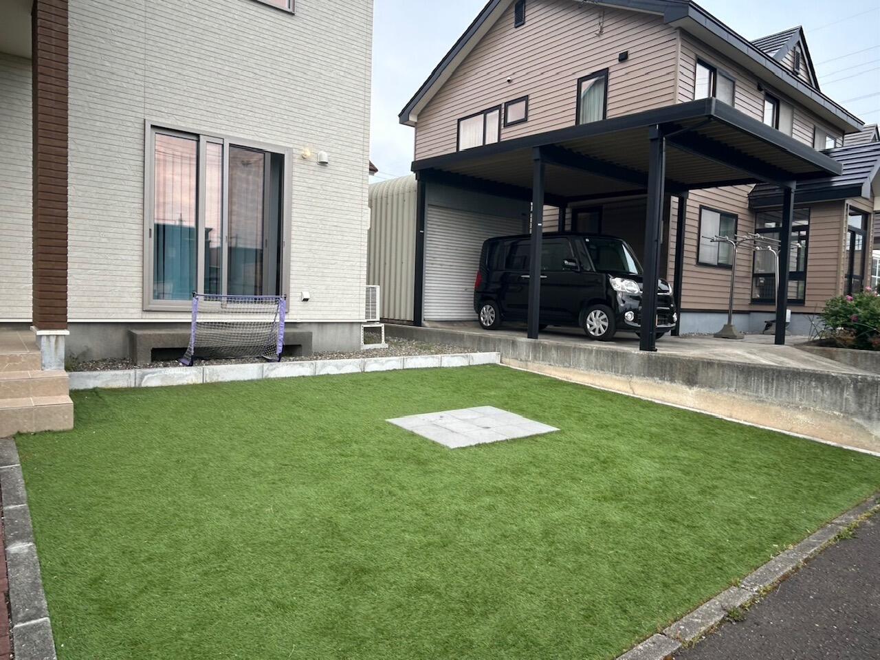 2年前に外構の施工した時は人工芝に平板を置いて BBQ使用をメインで考えていたお庭。 お子様が小学生になり、サッカーをはじめ、 外壁・窓の損傷やお隣へのボールの侵入に不安を感じ ゴールネットを設置しました。 ご家族も近隣の方も安心してお庭で過ごせるようになりました♪